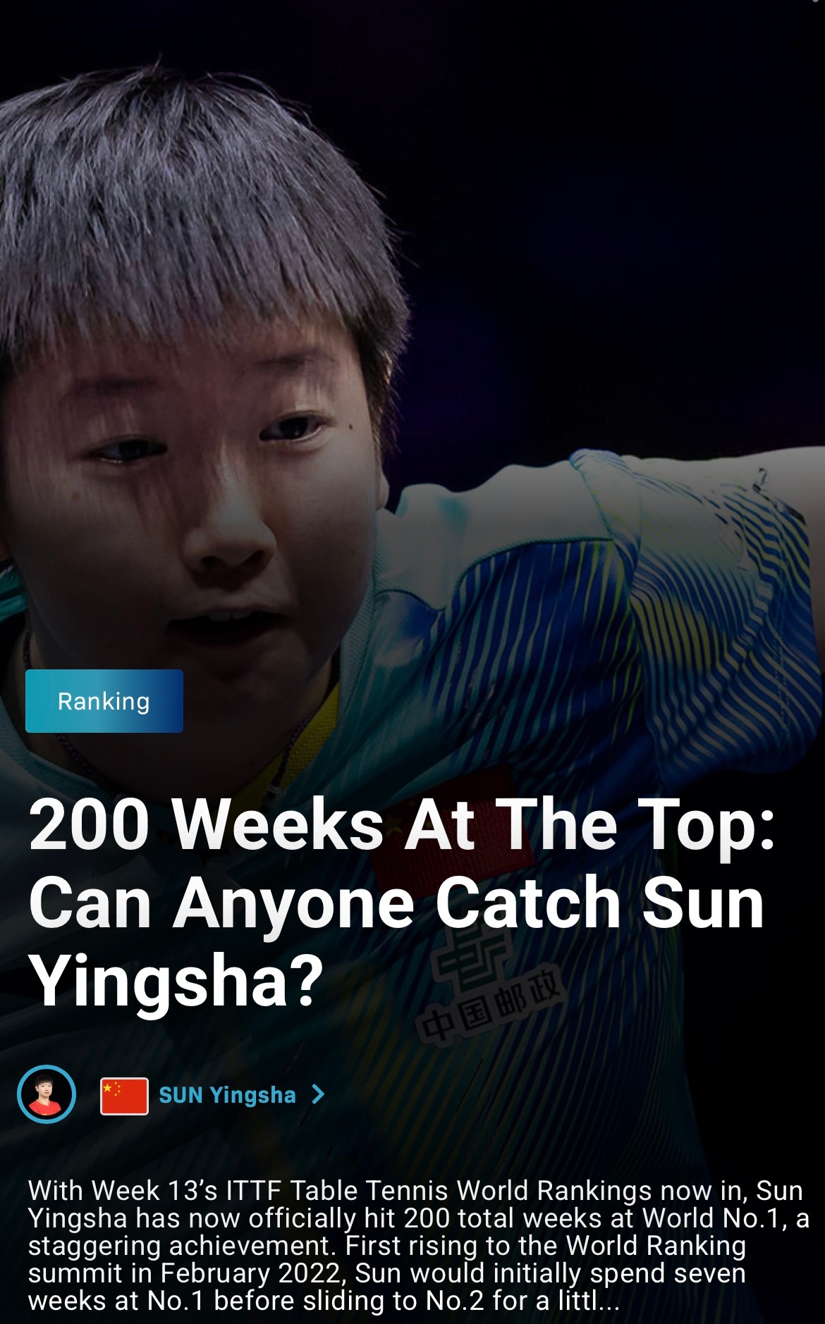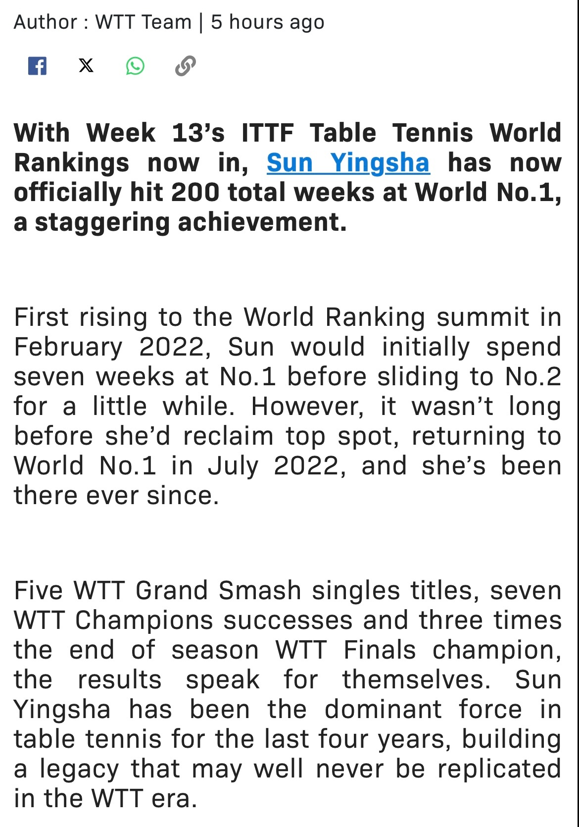 wtt官网更新👏🏻👏🏻世一孙颖莎又解锁新纪录/孙颖莎累计200周世排第一