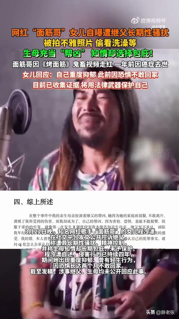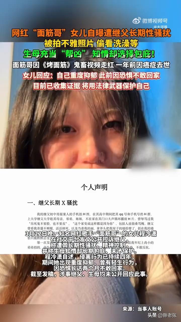 什么样的母亲能看着继父欺负自己的亲闺女而选择视而不见? 近日,已过逝的网红歌手“面筋哥”的女儿程冷潇在社交平台发文公开控诉继父,称遭其长期性骚扰、精神控制,并称生母知情却长期包庇、未予保护。 又是一起继父觊觎女儿的典型案例,而且亲妈也是不作为!不保护自己的孩子还包庇继父! 这是什么样的母亲?她的所作所为真的是枉为人母! 这样的家庭真的有温暖吗?如果有独立的生活能力,建议还是离开这样的家庭吧!