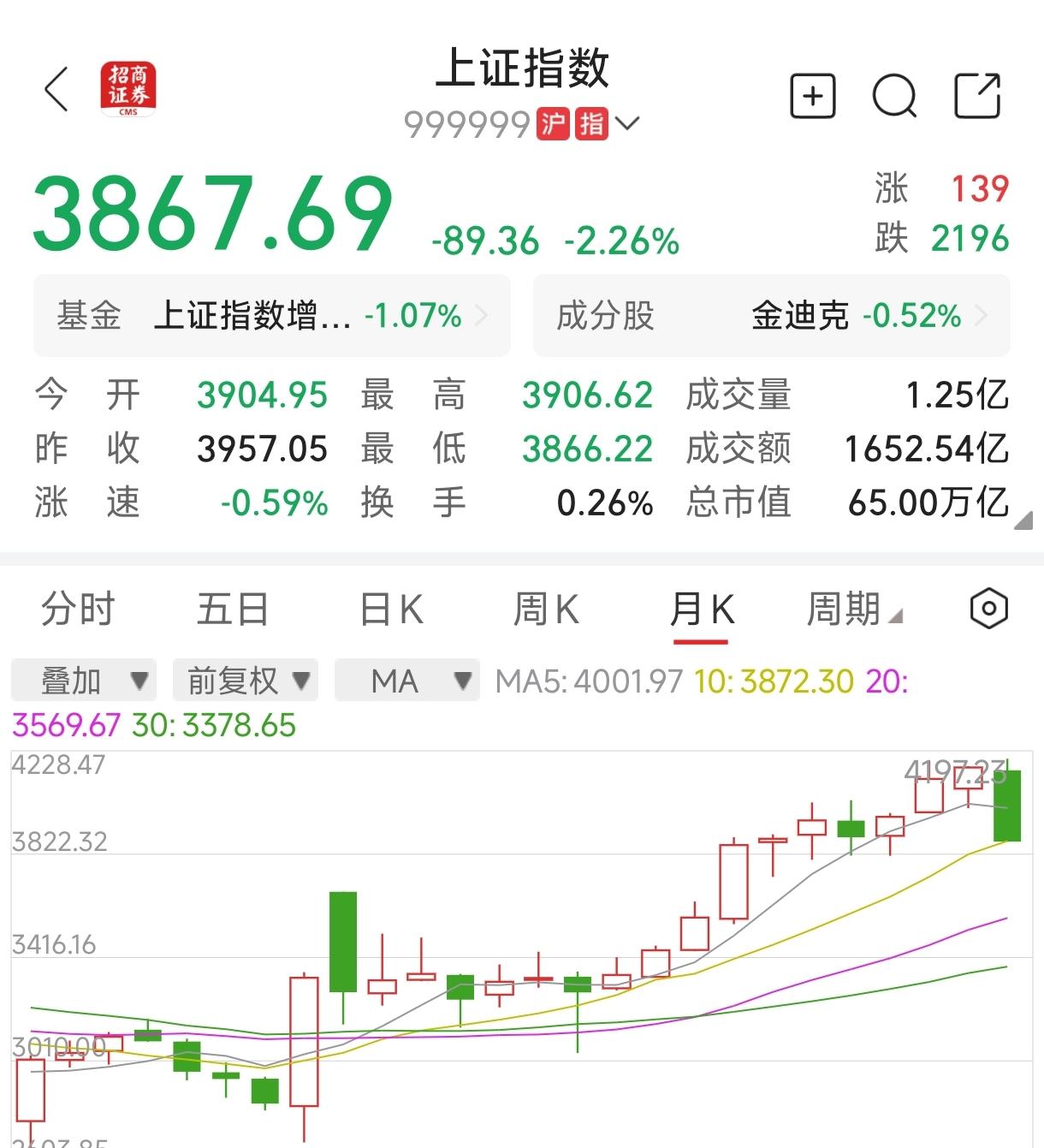 快讯,上证指数跳空低开并延续下跌势头,当前下跌2.26%,5036家公司股价下跌。 ●上证指数23日以3904.95点开盘,比上一交易日收盘点位低开52.1点,跌幅1.3%;开盘后单边下行,当前3867.69点,较上个交易日下跌89.36点,跌幅2.26%。 上证指数52周内最高点4197.23点是3月4日创造的,最近14个交易日已经累跌329.54点,累计跌幅7.85%。 纵观沪深京市场,5036家公司下跌(13加跌停),427家公司上涨(17家涨停)。