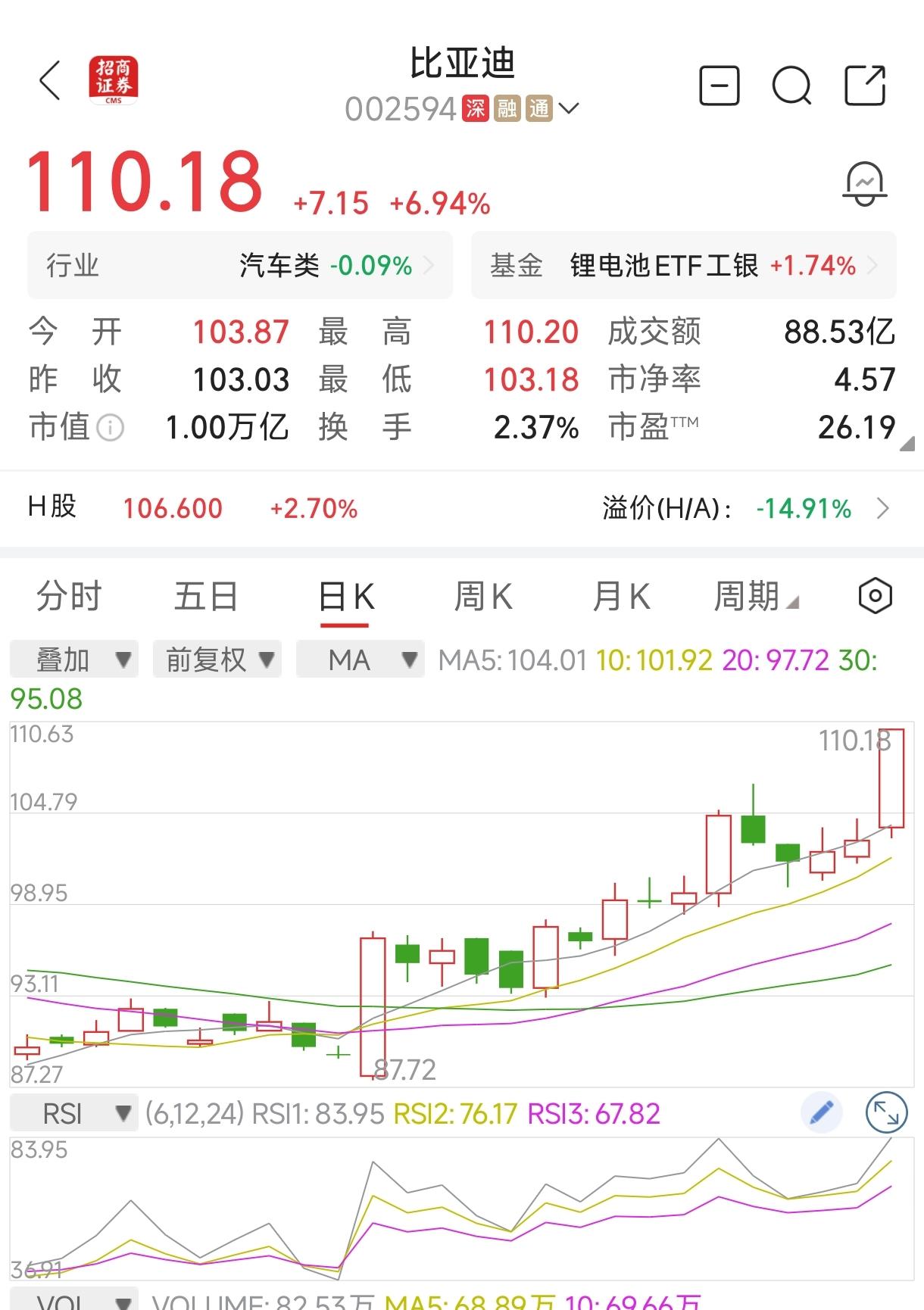比亚迪股价大涨6.94%市值突破10000亿元,吉利汽车股价大涨5.14%,奇瑞汽车上涨1.74%、赛力斯上涨1.88%,零跑汽车上涨3.28%,长城汽车上涨0.47%,这些上市车企股价今日逆势大涨。 比亚迪股价大涨后市值来到10000亿元,再次站上10000亿元台阶,市值显著领先于其他车企。吉利汽车市值来到1939亿元稳居第二名。 不过,理想汽车下跌1.6%,广汽集团下跌1.4%,长安汽车下跌1.1%。比亚迪 吉利汽车