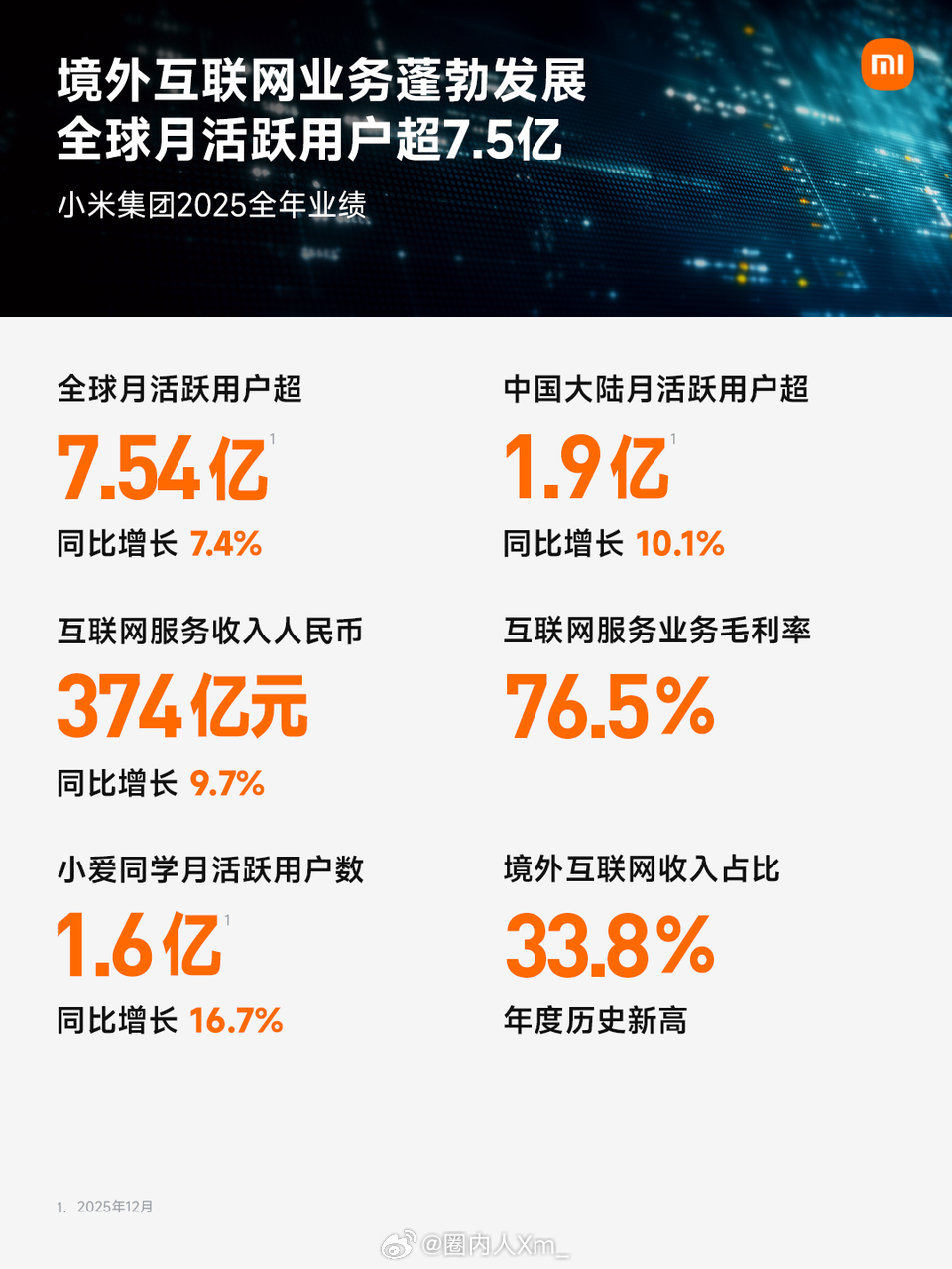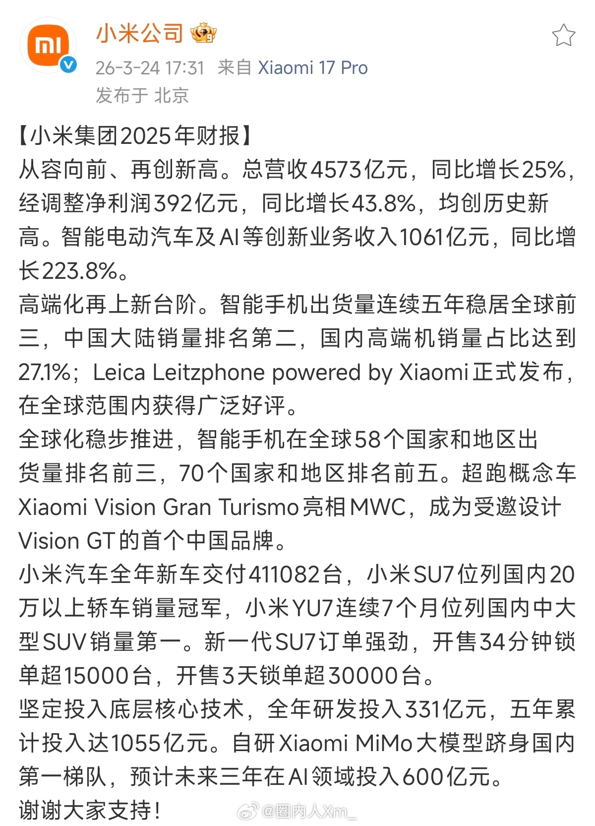 小米集团 2025 年全年营收 4572.9 亿元人民币,同比增长 25%。小米