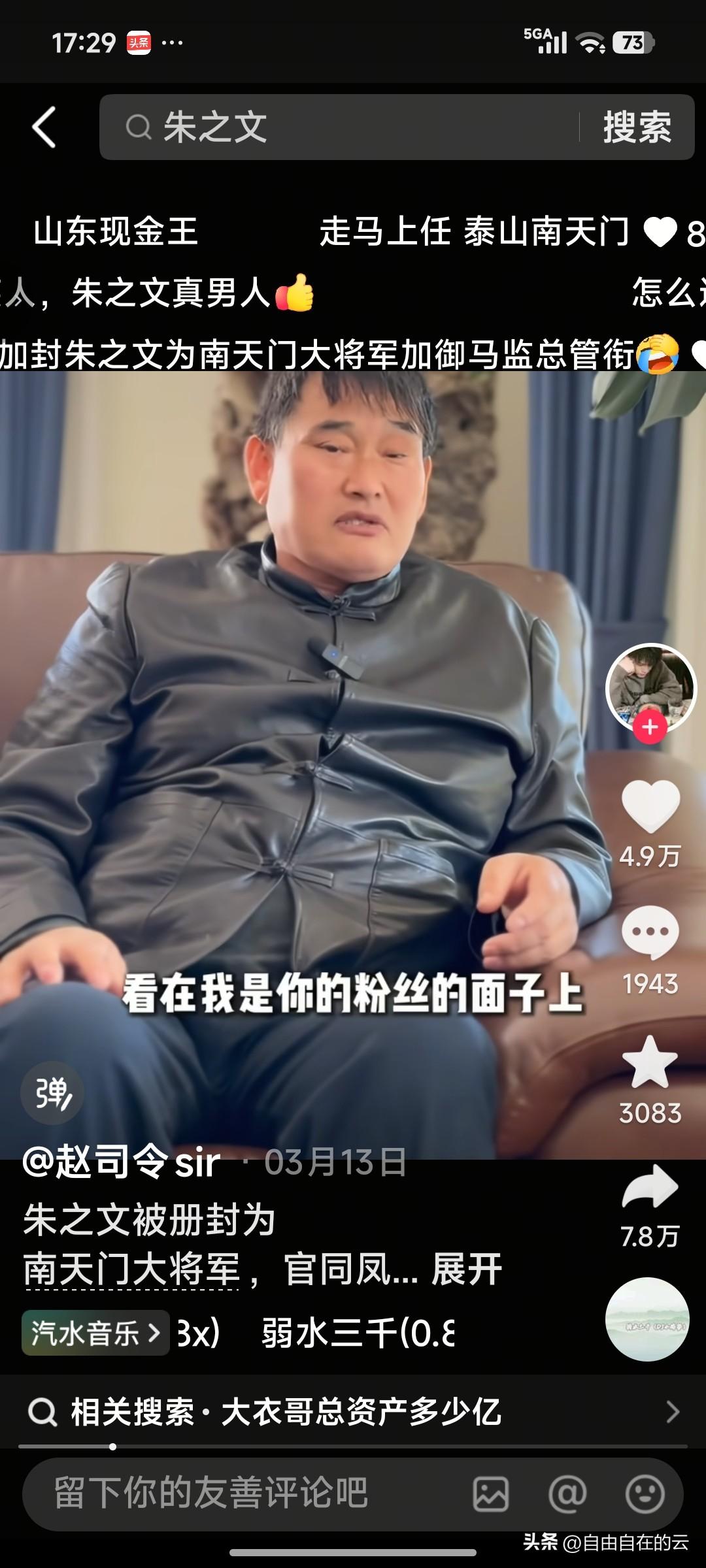 没想到大衣哥身上这么多趣事。 大衣哥说,曾经他的一个粉丝给他发消息,说自己妈妈生病了,家里很困难,希望能捐给他3万块钱,他还留了个银行账号。 大衣哥还就真信了,给账号里打去了3万块。过了几天,就收到粉丝给他发的文件。上面写着,“皇帝诏曰,朱之文捐钱有功,特封他为南天门大将军。” 这还没完,又过了几天,朱之文收到一个快递包裹,打开一看,又写着皇帝诏曰,发给你的工资。结果箱子里全是冥币。 这人也够缺德的,人家老朱帮你,你还给人家寄冥币。不过朱之文的心态好,他也不生气。我觉得朱之文常红还是有原因的。