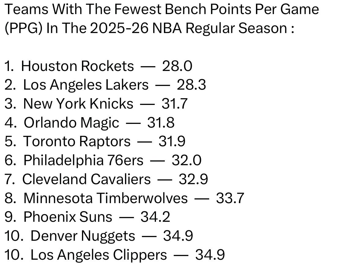 斯玛特领跑湖人队内总正负值,本赛季达到+238,里夫斯为+160,东契奇为+159。 本赛季球队替补场均得分,湖人升至倒数第二,倒数第一归属火箭队。
