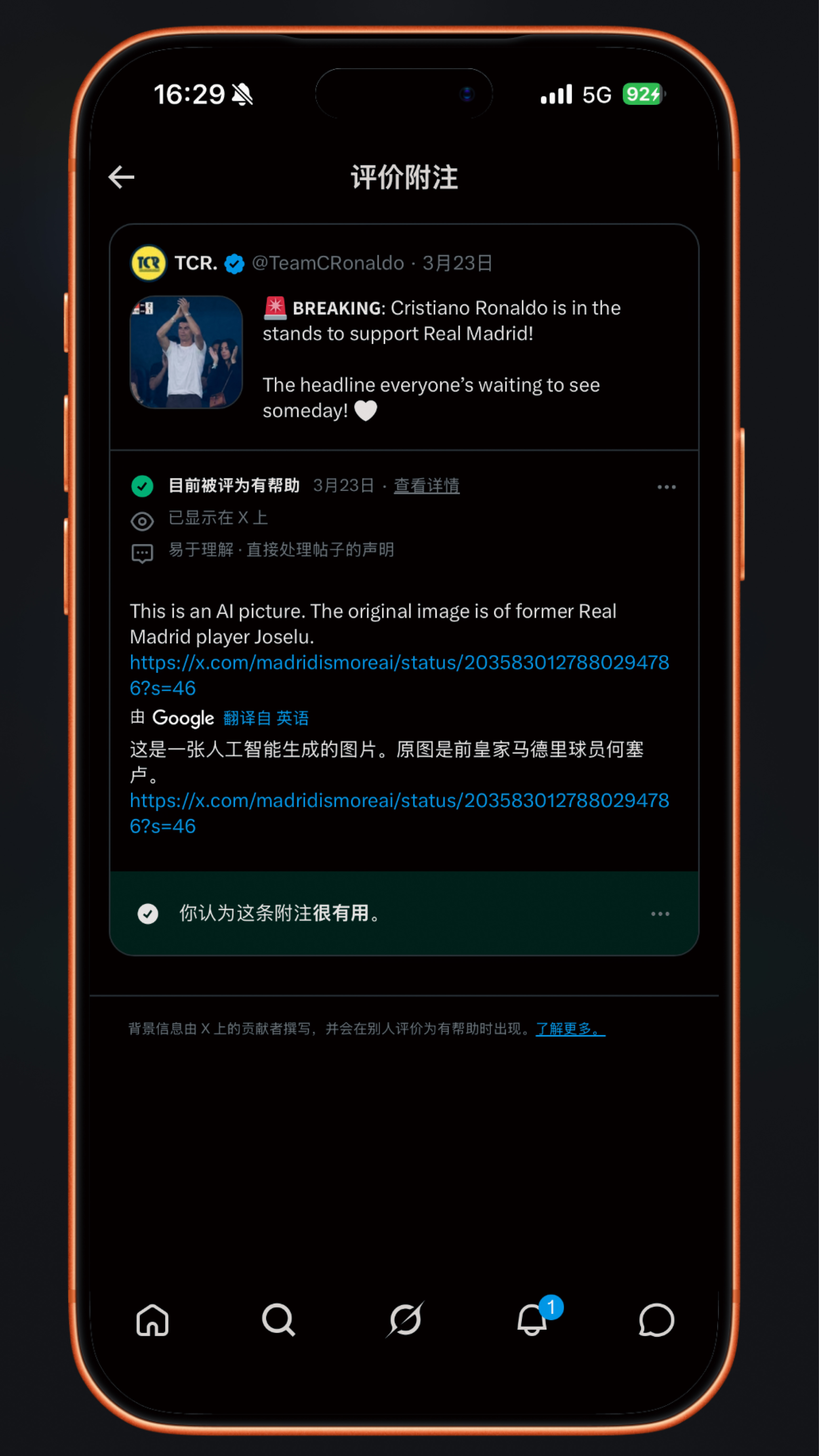 C罗并未观赛皇马 🛑 这两天,国内疯狂搬运外网TCR这则消息,称C罗现场观战了皇马的比赛,实则这则消息是TCR这个所谓的罗迷大粉用ai替换了前皇马球员何塞卢现场观战的脸。在我印象里,他有多次造谣罗哥的前科,然而依然有很多人进行转载并发布C罗观赛皇马的消息。事后TCR自己在附注里再次说明此为Ai制作,原图为前皇马球员何塞卢。C罗日常C罗 专栏 · C罗时刻❷ 专栏 · C罗谣言辟谣