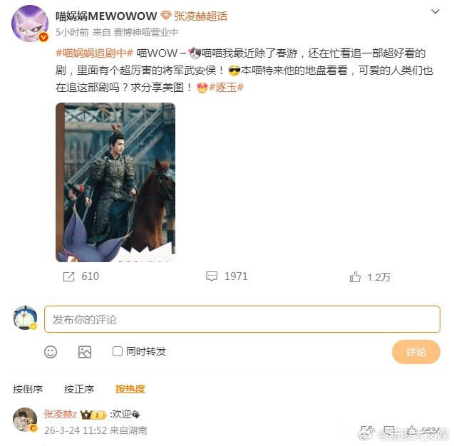 张凌赫田曦薇在喵娲娲评论区团建 谁懂啊!正主亲自下场互动也太宠了!《逐玉》本来就