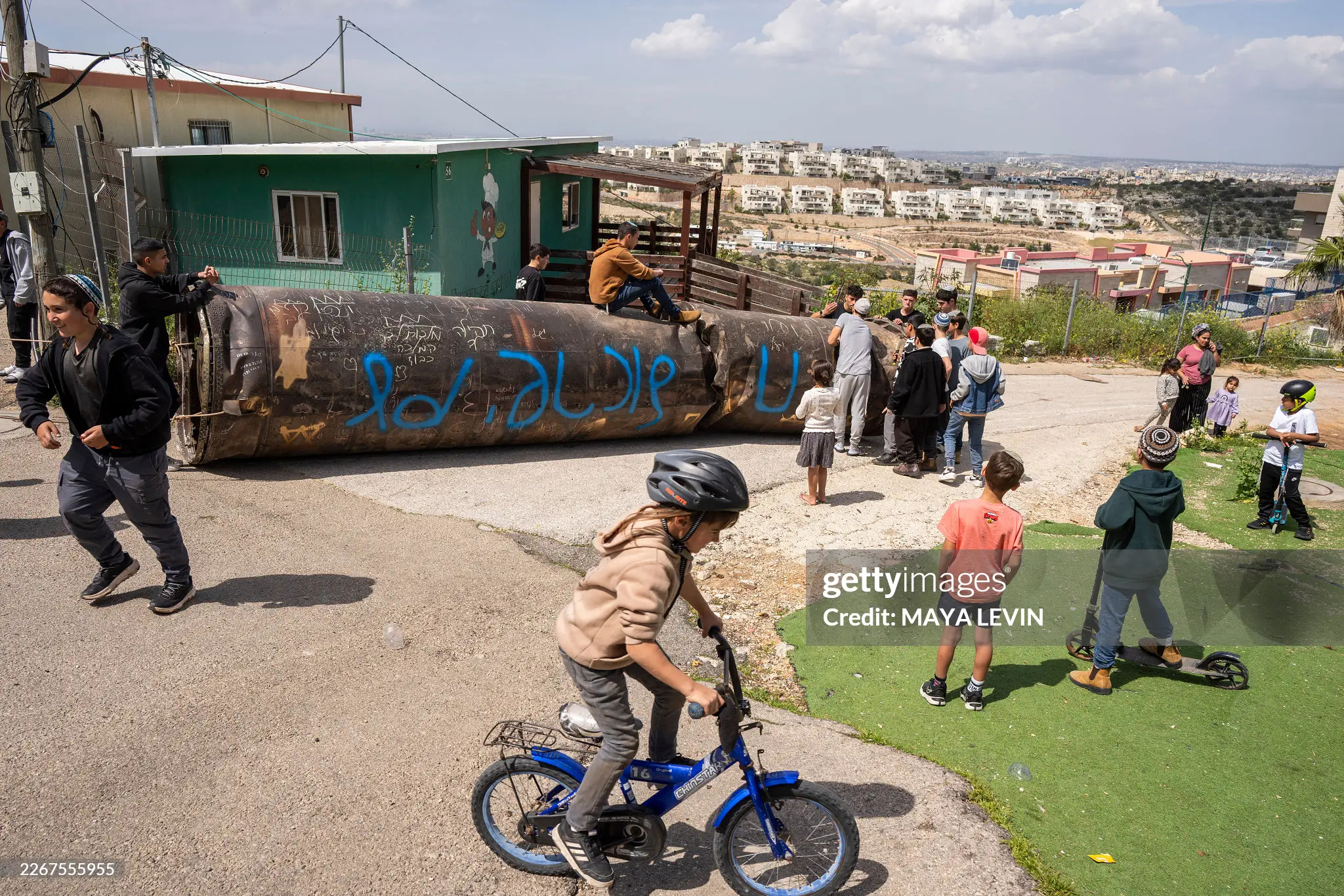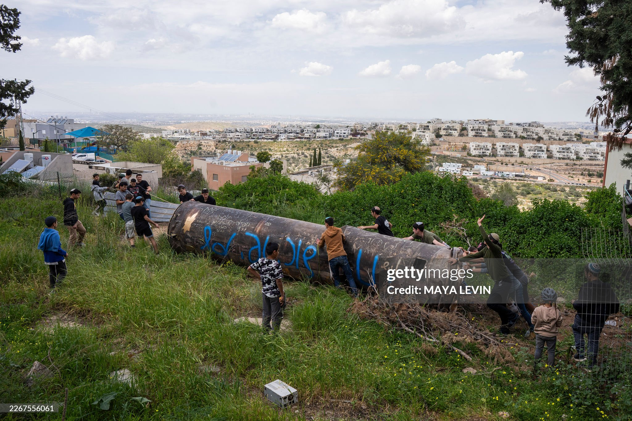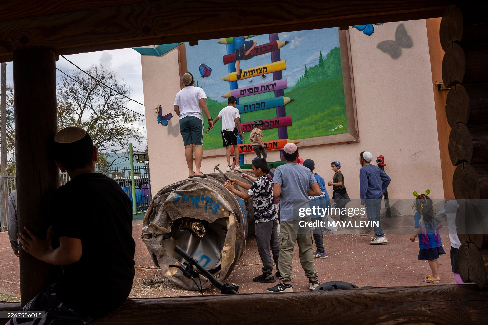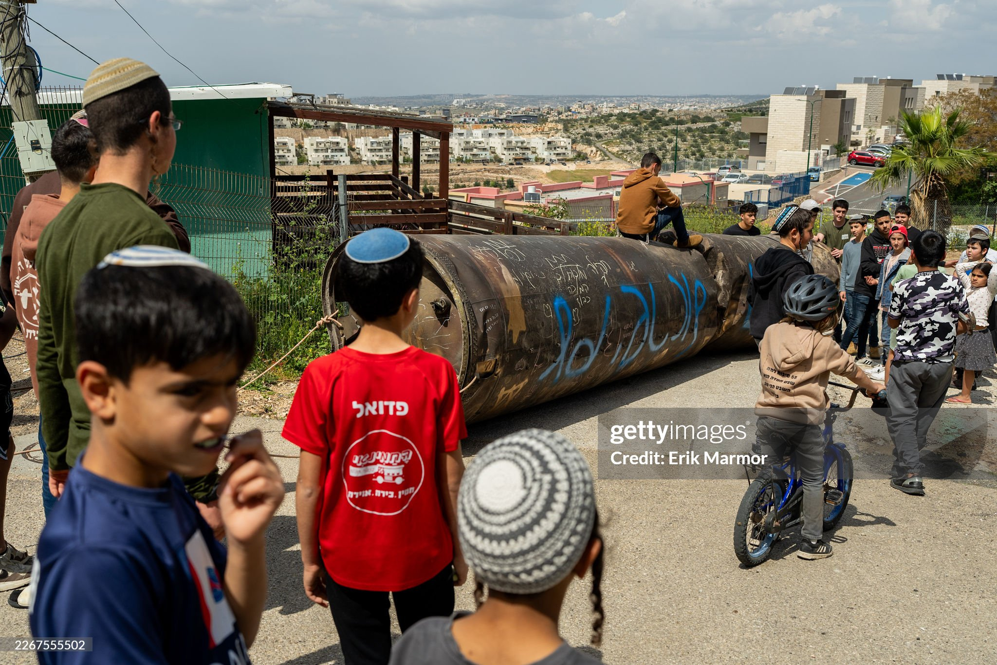 3月23日:在约旦河西岸的以色列定居点佩杜埃尔,以色列人将一枚伊朗弹道导弹的助推器残骸搬运到一座学校的操场上供儿童玩耍。美伊以冲突