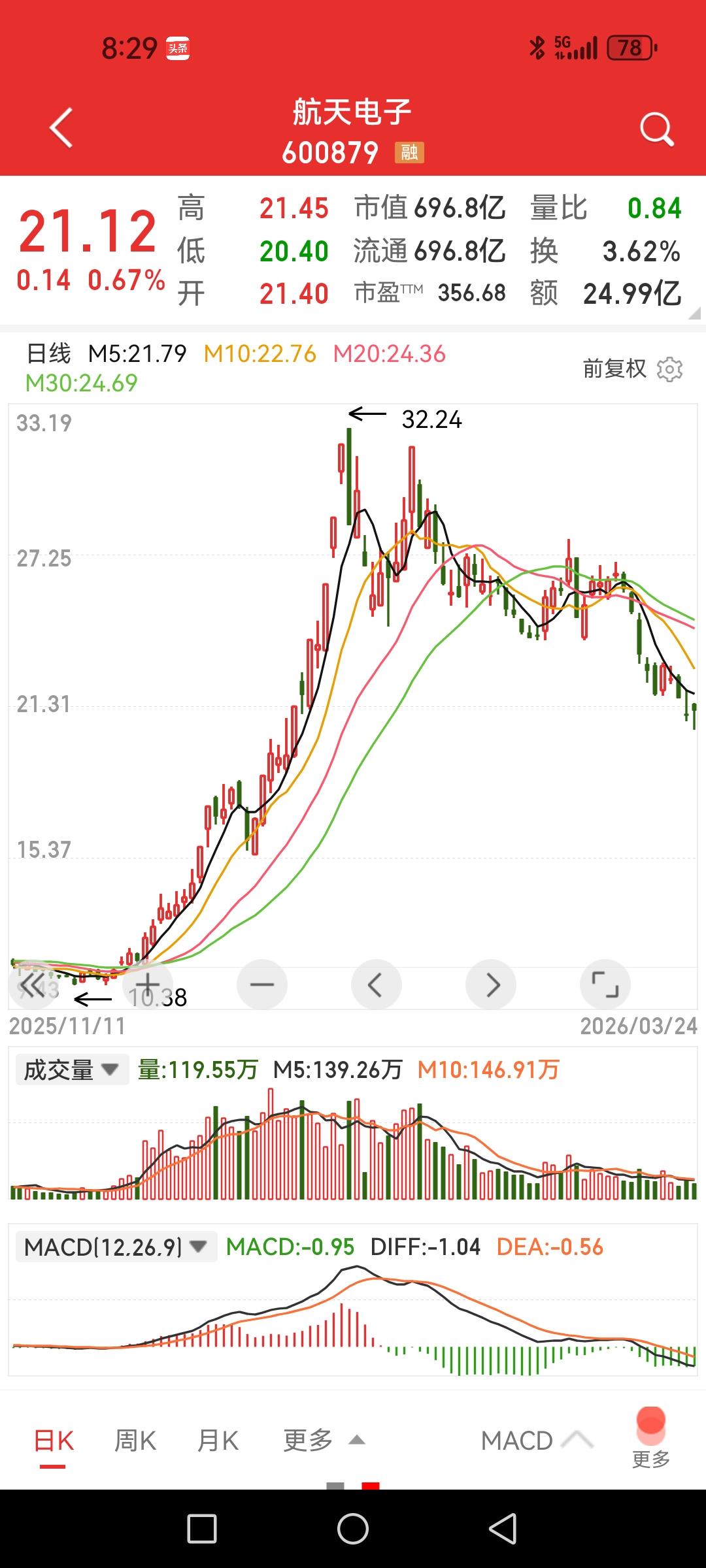 回过头来看看一度红得发紫的商业航天概念,你在里面吗? 中国卫星,最高点127.77元,现价78.36元,跌幅38.6%。 航天动力,最高点50.88元,现价30.42元,跌幅40%。 航天电子,最高点32.24元,现价21.12元,跌幅34.5%。 即便你不是最高点买入,哪怕是比最高点低10%追进去的,现在没走的话也套了20%以上。看看起涨点,现在还早着呢。不过我倒是很怀疑有多少散户敢去那么高的山顶价去追,至少十年以上的老股民没有一个! 再说一句题外话,现在你看得见一篇谈论商业航天的文章吗?