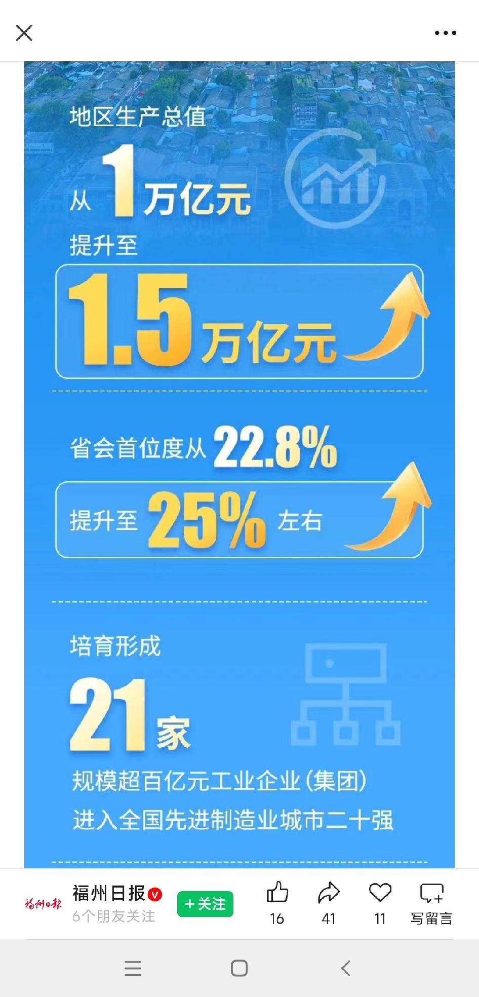 福州培育出21家规模超百亿元的工业企业,还跻身全国“先进制造业城市20强”。 “十四五”期间,福州经济总量每年跨一个千亿元台阶,数字经济规模超8300亿,国家高新技术企业数量翻番。 科技创新是福州发展新质生产力的核心驱动力。像闽都创新实验室,自主研发的硼酸锂等“中国牌”晶体国际市场占有率超70%,量子点发光材料全球领先。2026年“十五五”开局,福州以“奋勇争先突破年”为契机,未来肯定能在现代化经济体系建设中书写更精彩的篇章。