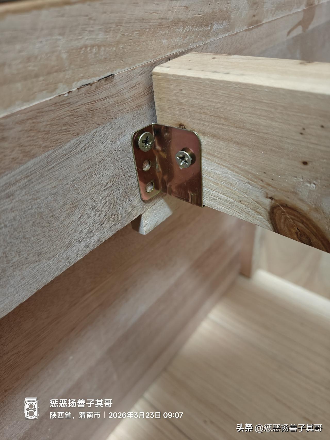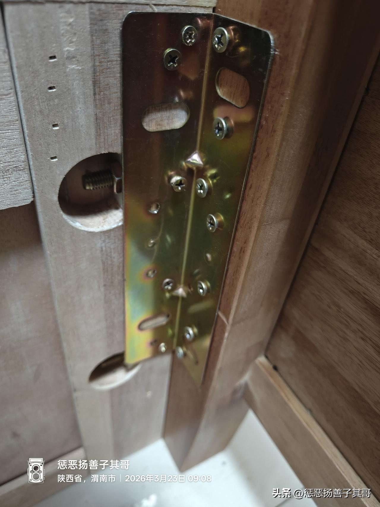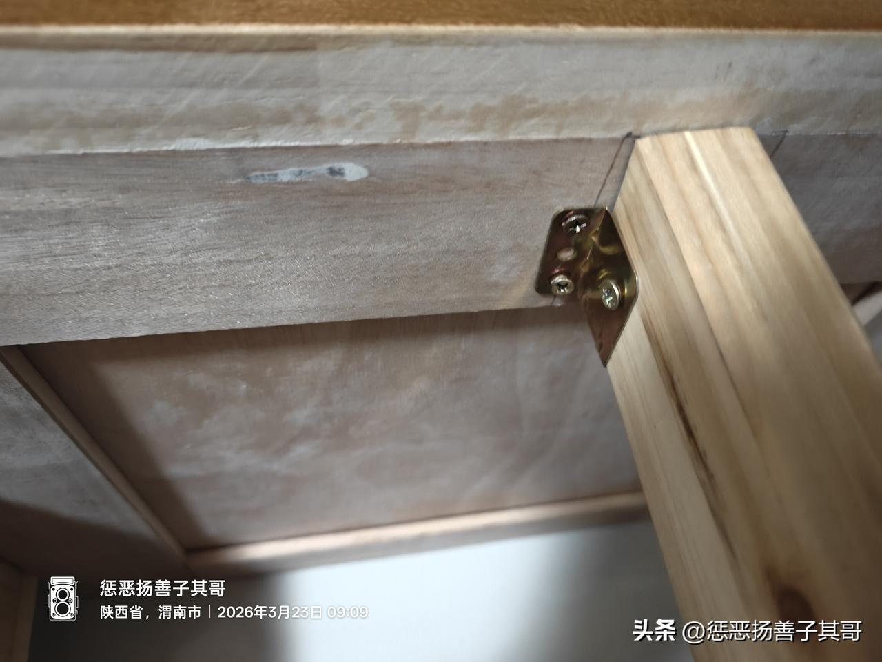 3.床的四个角除了8个锁扣螺丝连接,还有配的四个铁皮角铁,铁皮角铁也很薄(2毫米左右)。