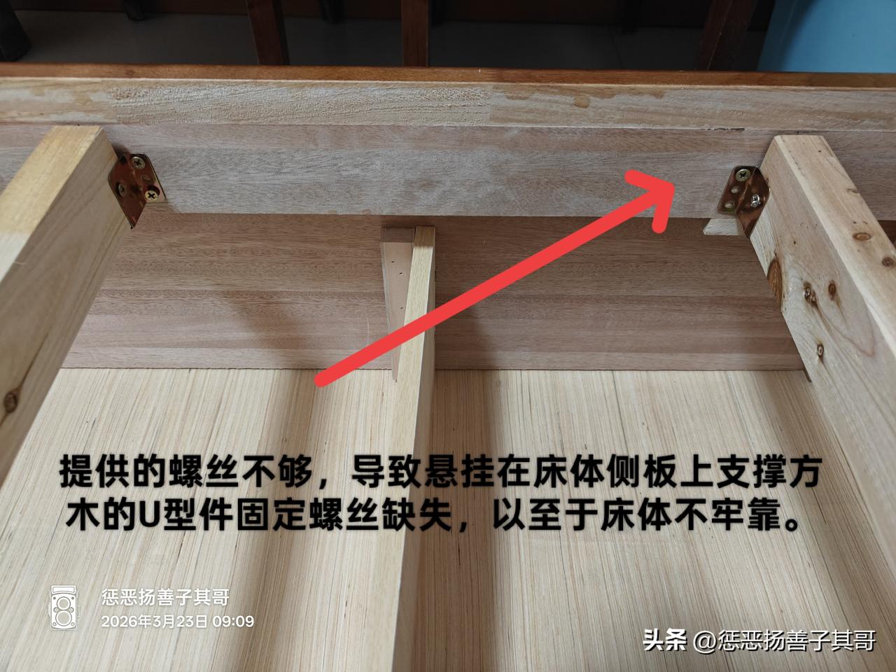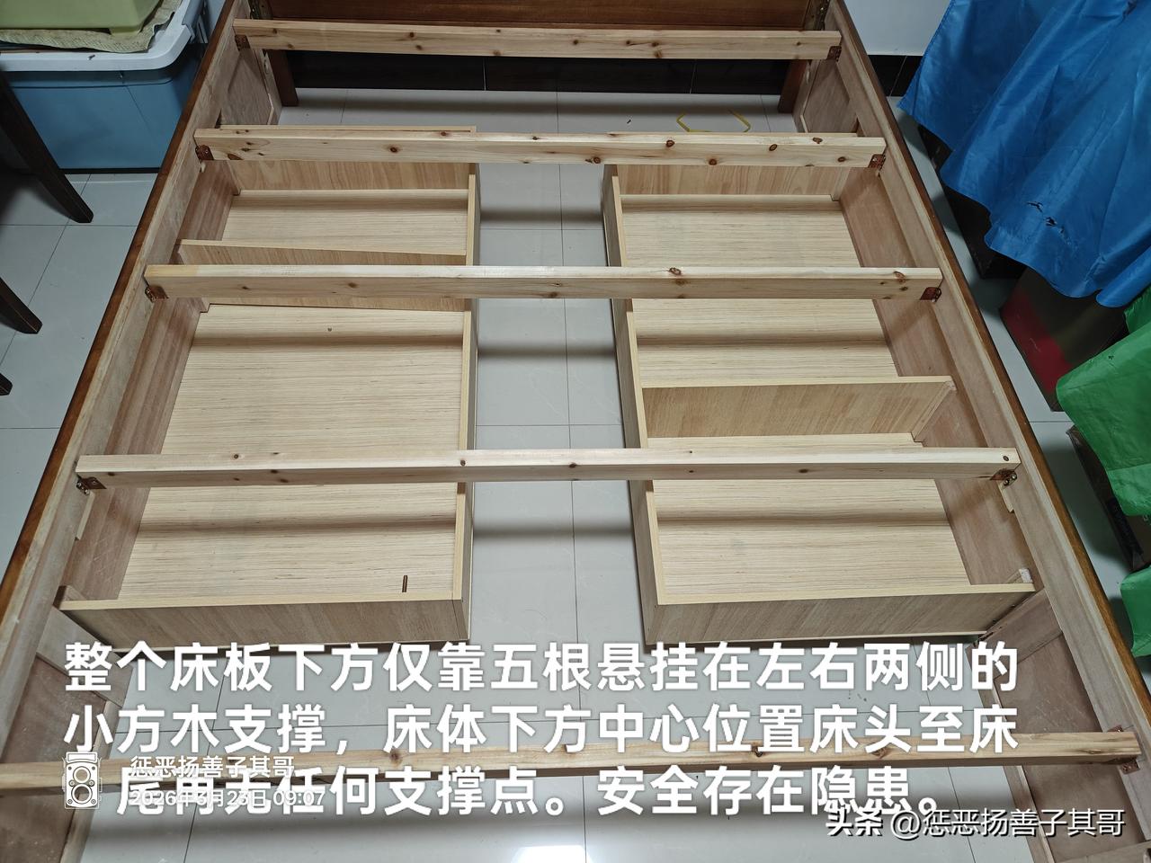 2.支撑床板的是中间五根小方木,方木连接处是U型卡子,卡子由螺丝悬挂固定在左右侧板,卡子铁皮很薄。整个床体中间无任何支撑点。