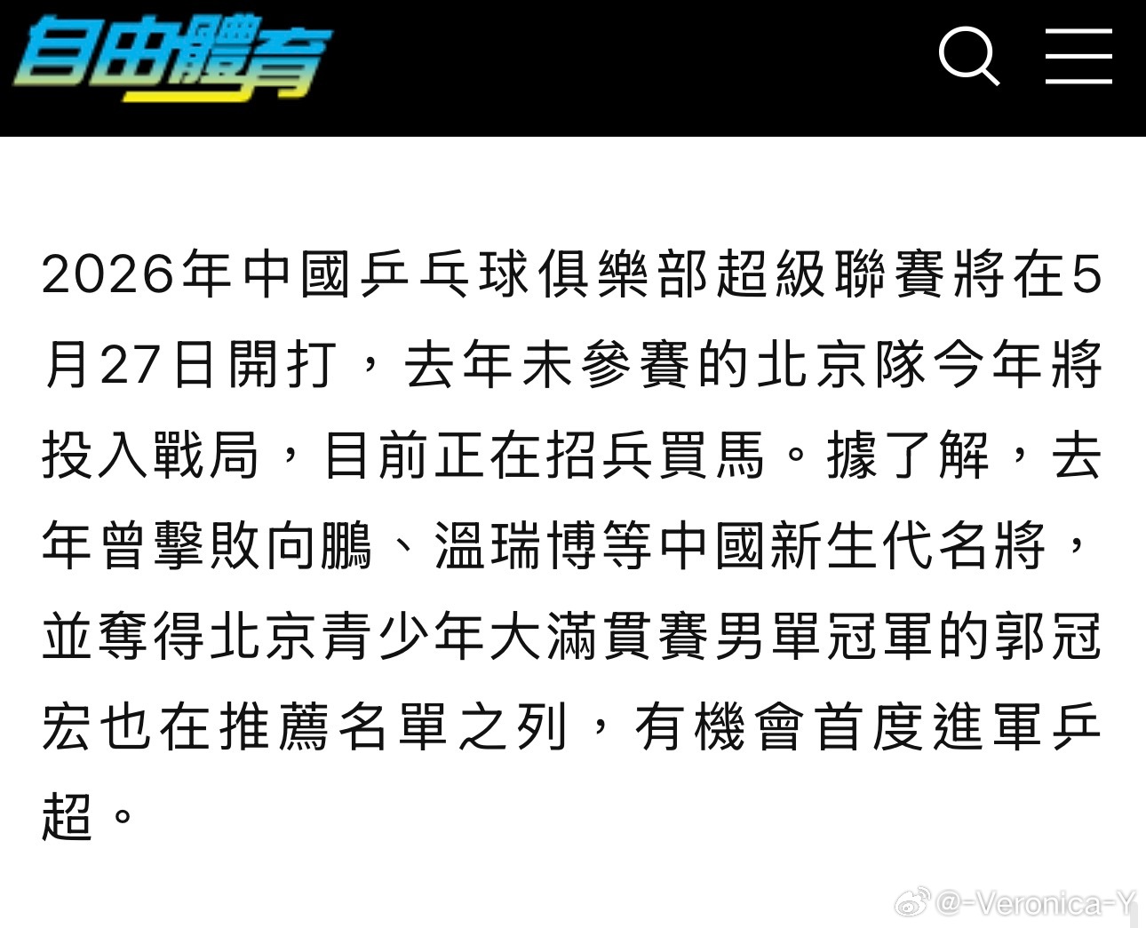 Breaking News北京队将组建俱乐部参加今年的乒超联赛郭冠宏可能会成为其