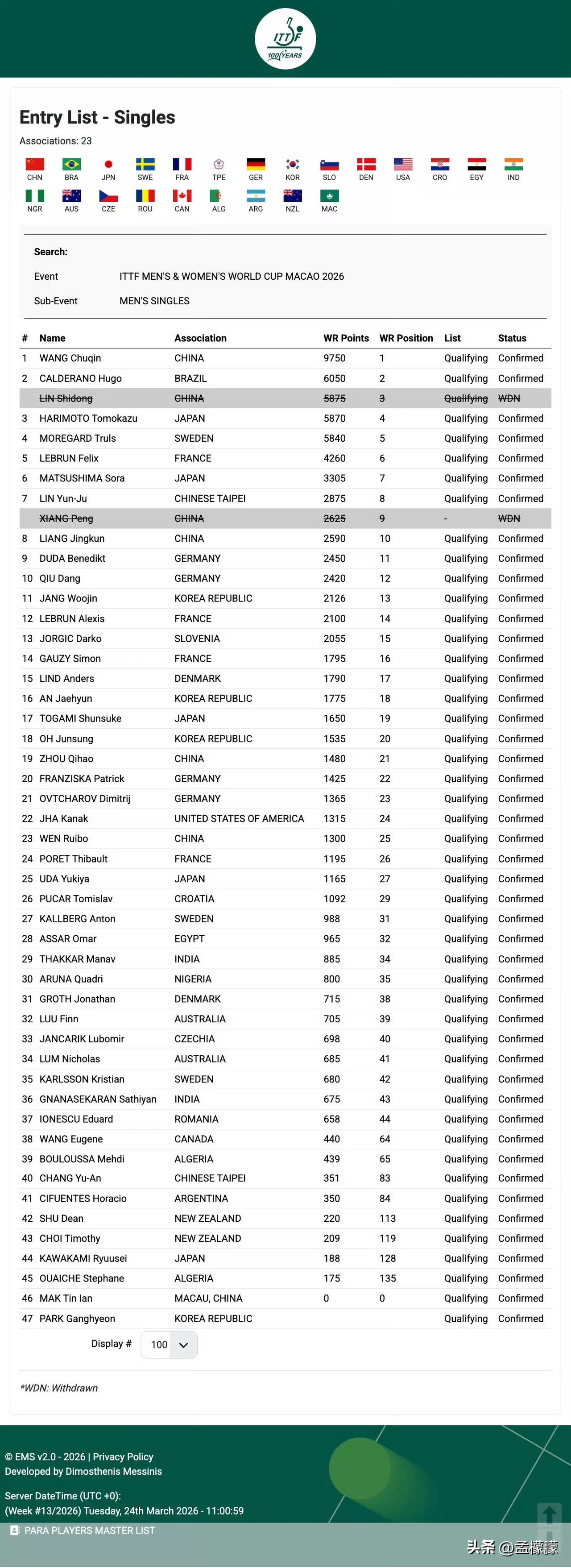 突发状况! 澳门世界杯2026国乒 林诗栋退赛 。 中国香港林兆恒递补。