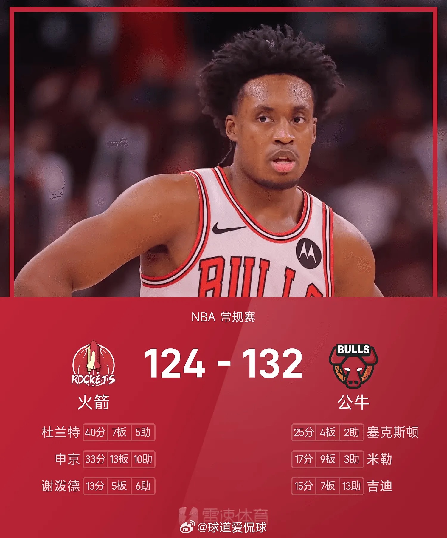 03月24日讯 25/26赛季NBA 常规赛,公牛对阵火箭。双方全场战罢,公牛132-124战胜火箭。塞克斯顿得到23分4板2助率队取胜,杜兰特空砍全场最高的40分7板5助。NBA体育明星公牛战胜火箭NBANBA常规赛
