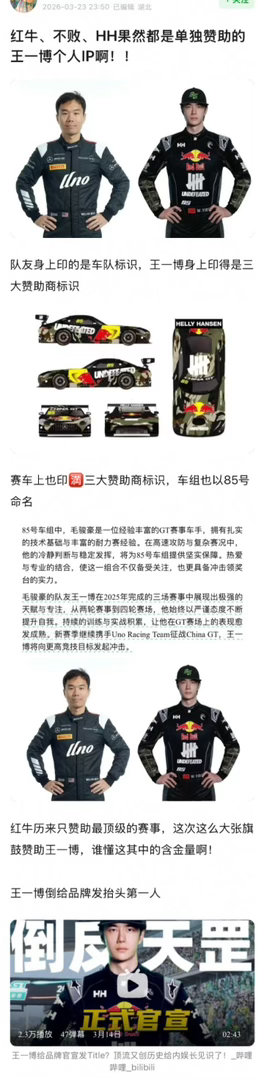 王一博赛车三大品牌都是赞助他的个人ip,只有王一博身上和85车组有。近5w人都是