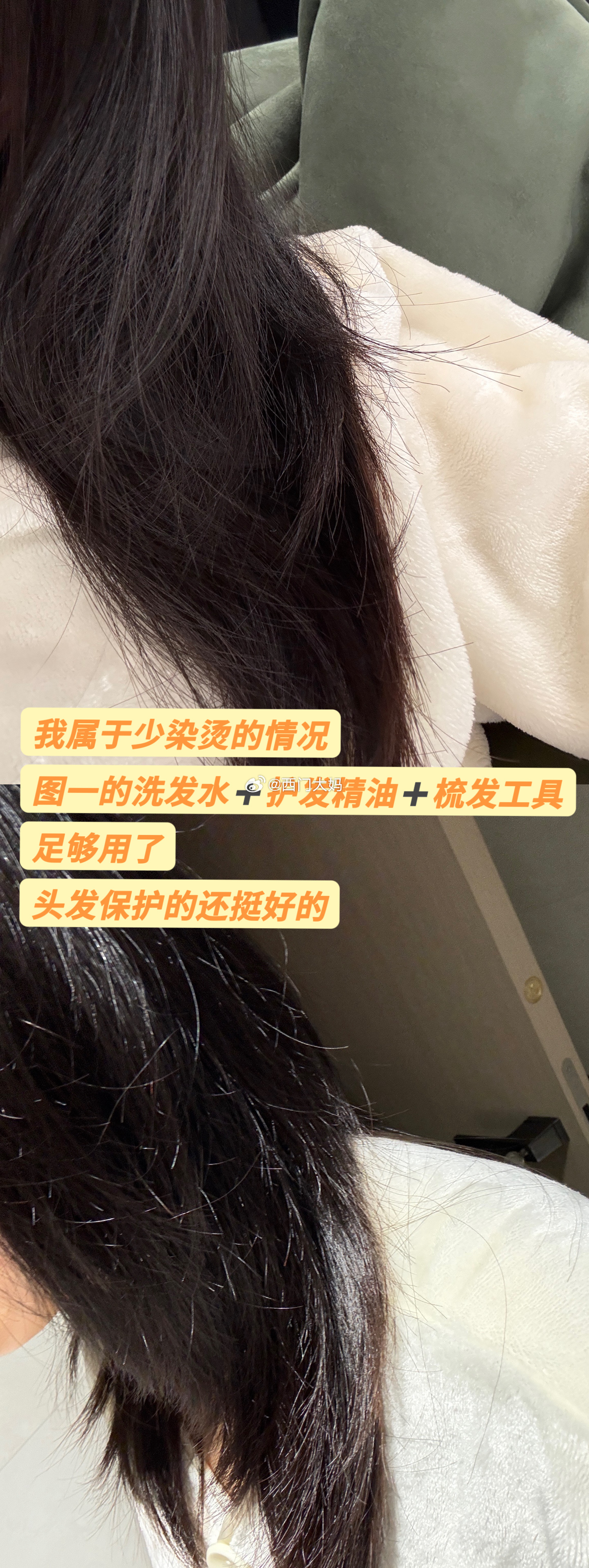 我是属于少染烫的情况,日常护发就靠勤洗头、清头皮、用对洗发水、涂护发精油,早上梳个头发提提神,根本没精力搞复杂流程。