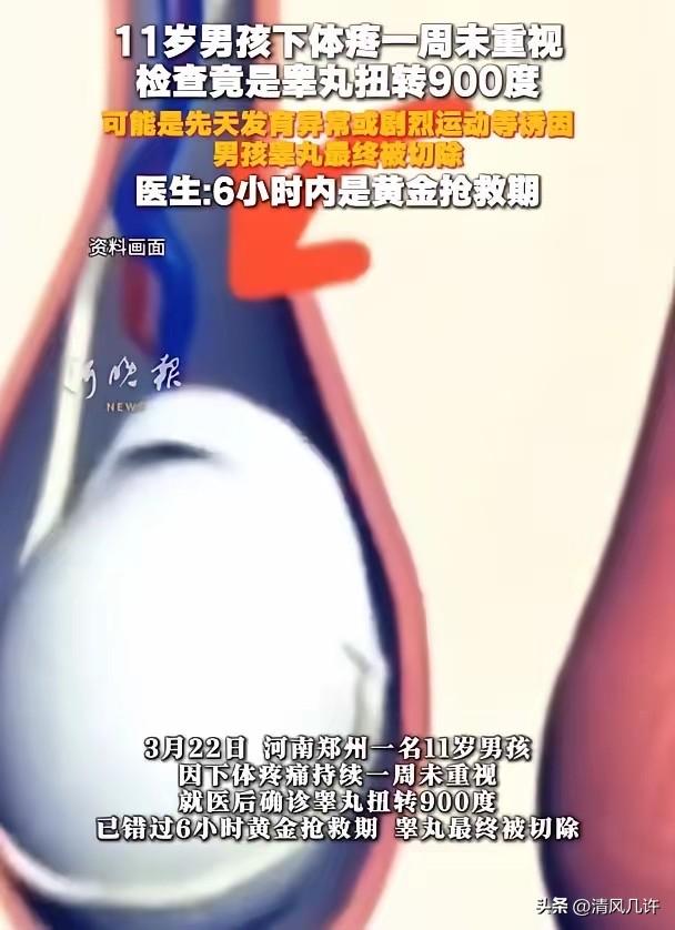 听着都疼!河南郑州,一名11岁男孩害羞的跟家长说下体疼痛,家长立刻带着孩子去医院检查,万万没想到,医生检查后发现孩子睾丸扭转900度,而且早就过了治疗的黄金时间,最后只能切除处理。 其实早在一周前,男孩就开始觉得下体隐隐作痛,可他年纪小,又害羞,不好意思跟家长说,只能忍着。 上课的时候坐立难安,走路也刻意放慢脚步,怕牵扯到疼处,可这些细微的变化,一开始并没有被家长察觉。家长只当是孩子在学校磕碰了,或是普通发炎,随便给孩子涂了点药膏,叮嘱他忍忍就好,压根没往严重的地方想。 直到后来,家长发现孩子走路姿势越来越奇怪,总是捂着一侧小腹,连跑跳都不敢,反复追问下,男孩才红着脸说出实情。家长这才慌了神,赶紧带着孩子往医院赶,可他们不知道,这一周的拖延,已经彻底错过了救治的关键窗口。 到了医院,医生立刻给孩子做了彩超检查,结果显示患侧睾丸已经没有任何血流信号,意味着供血完全中断。 术中探查时,医生更是倒吸一口凉气,孩子的睾丸足足扭转了900度,精索像拧成了死结的麻花,血管被彻底绞断,睾丸组织已经完全坏死,根本没有挽回的余地,只能做切除手术。 躺在手术台上的男孩还不知道这意味着什么,可家长在手术室外,听着医生的解释,眼泪止不住地往下掉。他们后悔自己的疏忽,后悔没有早点重视孩子的疼痛,可再多的后悔,也换不回孩子被切除的睾丸。 医生看着崩溃的家长,只能一遍遍安抚,同时反复强调,睾丸扭转是青少年男性最凶险的急症之一,发病后6小时是黄金抢救期,超过这个时间,睾丸存活率就会急剧下降,超过24小时基本就无法保住。 这个病没有特效药,唯一的救治方法就是争分夺秒手术复位,哪怕多耽误一分钟,都可能造成无法挽回的后果。 医生还说,睾丸扭转的诱因有很多,先天发育异常是主要原因,剧烈运动、睡眠翻身挤压,甚至孩子不经意的触碰,都可能成为导火索。可很多家长和孩子都对这个病一无所知,孩子因为害羞隐瞒症状,家长又容易当成普通小病处理,最终酿成悲剧。 这件事被报道后,瞬间引发了无数家长的恐慌和反思。有人说,自己家也有小男孩,以后一定要多留意孩子的异常表现,不能让害羞耽误了病情;也有人自责,说之前总觉得孩子喊疼是矫情,现在才知道,有些疼痛背后藏着致命的风险。 更多人开始呼吁,要把这类健康知识普及给更多家庭,尤其是青春期的男孩和他们的家长,让大家知道,下体疼痛从来都不是小事,更不是难以启齿的羞耻,及时就医才是对自己最负责的选择。 这个11岁男孩的遭遇,像一记警钟,敲醒了无数人。 它告诉我们,健康从来都没有侥幸,任何细微的不适都值得被重视,尤其是涉及到隐私部位的疼痛,更不能因为害羞或疏忽而拖延。黄金6小时,不仅是医学上的救治期限,更是对每一个家庭的提醒:别让一时的大意,变成一辈子的遗憾。 各位读者你们怎么看?欢迎在评论区讨论。