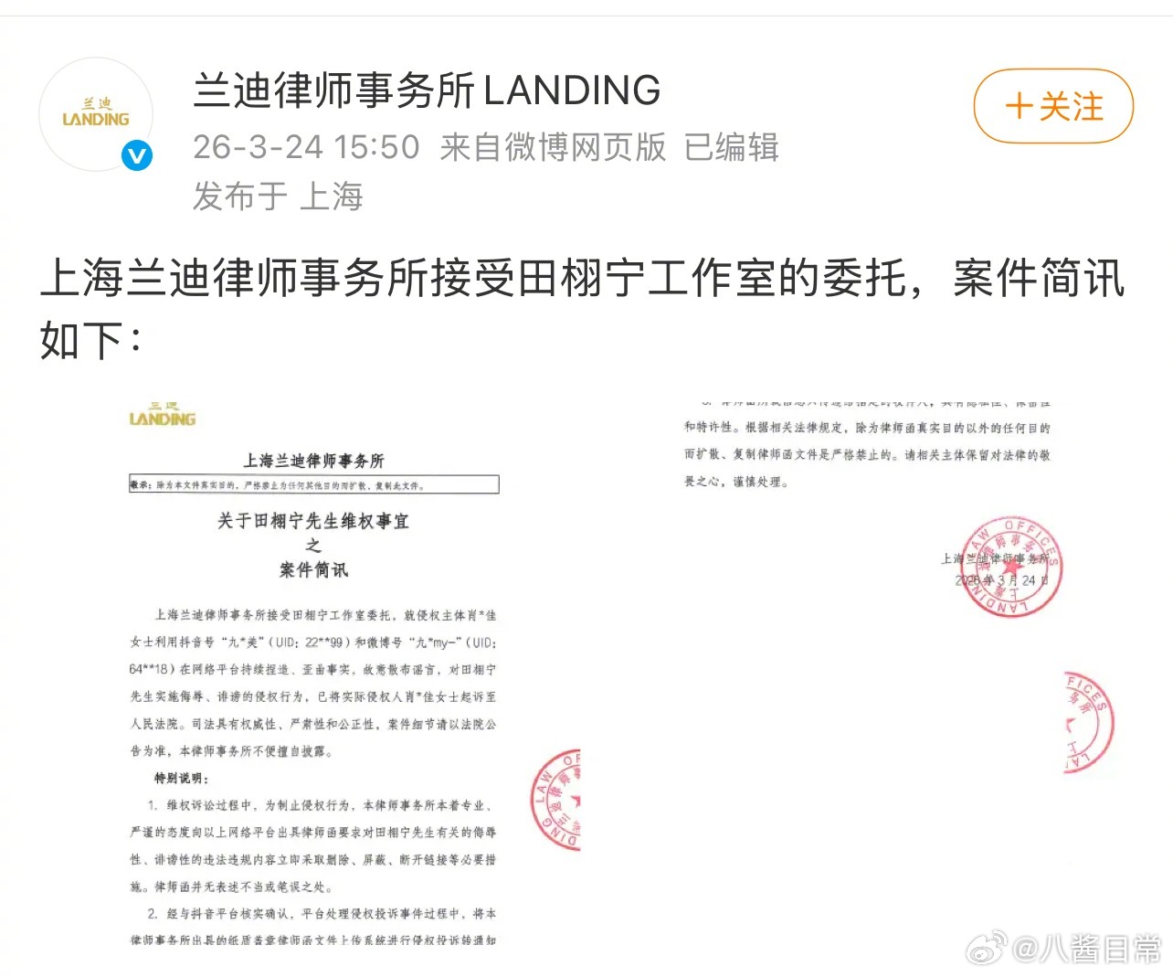 律师发了田栩宁告九成美维权案件简讯