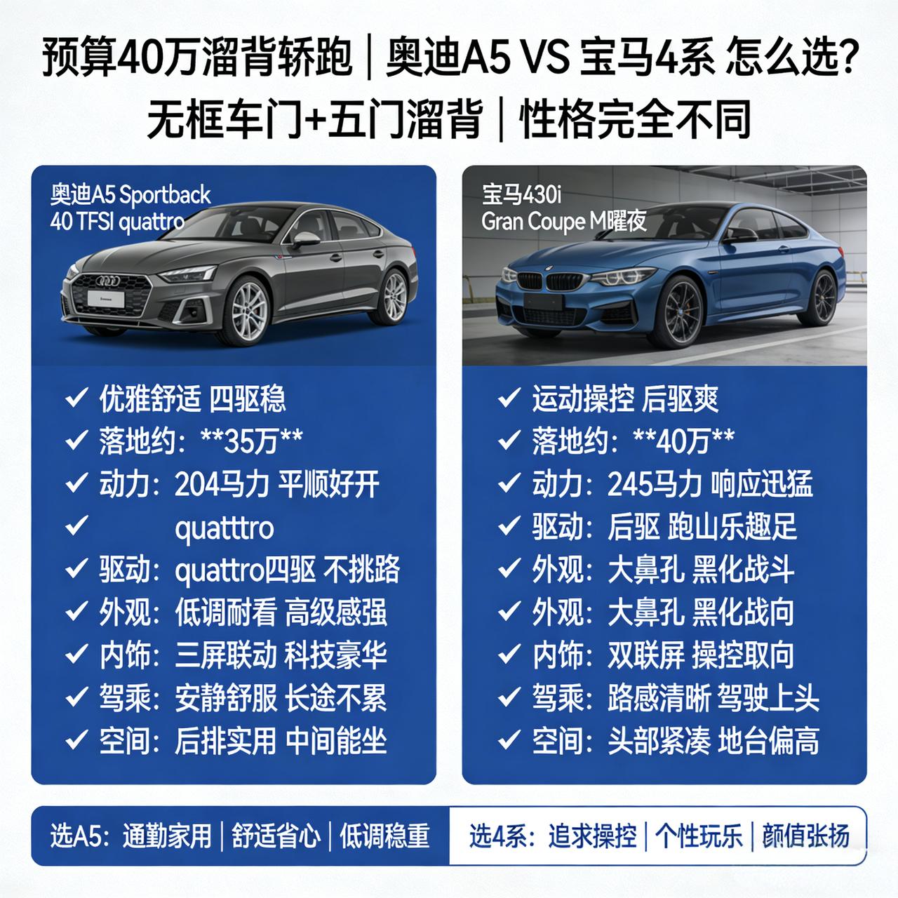 预算40万左右想买个溜背轿跑,奥迪A5和宝马4系,到底怎么选? 这个问题我后台被问了几十遍。两台车都是五门溜背、无框车门,价格也差不多,但开起来完全是两回事。 我试驾了2025款奥迪A5 Sportback 40 TFSI quattro和2024款宝马430i Gran Coupe M运动曜夜,各开了三天,东莞的市区、高速、银瓶山都跑了,今天跟大伙唠点真实的。 先说结论:不是一个性格 奥迪A5:我想优雅地开,偶尔也可以快一下。 宝马4系:我想痛快地开,偶尔也可以优雅一下。 一个是四驱稳重型,一个是后驱乐趣型。没有谁比谁好,看你想要哪种感觉。 价格: · 奥迪A5 Sportback 40 TFSI quattro:指导价41.88万,东莞终端优惠后裸车约32万,落地35万左右。 · 宝马430i Gran Coupe M运动曜夜:指导价42.69万,东莞这边优惠后裸车约36-37万,落地要奔着40万去了。 看出来了吧,我借的这台4系是430i高功率版,比A5 40 TFSI低功率版贵了大概4-5万。如果你预算卡在38万,那4系只能看425i(低功率),那才是和A5 40 TFSI的真正同级对手。 外观:一个耐看,一个张扬 A5,经典的溜背造型,线条干净。侧面是最绝的角度——车顶从B柱开始下滑,比例很协调。我第一天开出去,加油站的师傅问我:“这车得五六十万吧?” 4系,第一眼肯定是那个大鼻孔。M运动曜夜版全车黑化,中网、窗框、轮毂全是黑的,配上低趴车身,看着特别战斗。 我的感受:A5越看越耐看,不张扬但有质感。4系一眼就能认出来,个性很足。A5适合天天看,4系适合周末开出去浪。 内饰:一个科技,一个运动 A5这次换代(2025款)内饰终于跟上节奏了,12.3英寸仪表+14.5英寸中控屏+10.1英寸副驾屏,三屏联动的科技感确实比4系那个双联屏看着更“显贵”。高配还有B&O音响,氛围灯一开,高级感拉满。 4系的内饰,12.3英寸+14.9英寸曲面双联屏,iDrive 8.5系统操作丝滑,旋钮、触控、语音三种方式随心切换。M风格方向盘握感扎实,座椅包裹性强,连缝线颜色都在提醒你:“该踩油门了!”但问题也来了——实体按键几乎被砍光,调个空调都得看屏幕,对老派司机来说需要适应。 实际体验:城里堵车,我更喜欢A5的氛围,安静舒服。上了高速或山路,4系的支撑又让人踏实。 开起来:最大的区别 奥迪A5:四驱稳,开着不累 A5这个车,点火开出去第一个感觉就是——顺。 2.0T低功率发动机,204马力、320牛·米,配7速双离合。数据看着不炸裂,但开起来够用。 城里开,油门初段不窜,堵车跟车很轻松。变速箱换挡平顺,不盯着转速表几乎感觉不到。 高速开,quattro四驱让车身稳得像吸在地上,噪音控制比4系好,车里正常说话很清楚。 山路开,quattro抓地力强,过弯极限高。但你总觉得车在“推”着你走,转向偏轻,路感没那么清晰。 宝马4系:后驱爽,开着上头 换到4系,第一脚油门就不一样了。 2.0T高功率,245马力、400牛·米,比A5多了41马力、80牛·米。宝马把这套动力调得特别“窜”。 城里开,油门反应快,点一下就有。变速箱降档积极,深踩油门马上降两档,推背感就来了。但堵车有点累,太灵敏了,得一直控制脚法。 高速开,底盘比A5硬,路感更清晰,但噪音也更大。方向盘手感重一些,开长途没有A5从容。 山路开,这才是4系的主场。调到Sport模式,入弯车头很愿意进去,后轮微微往外走,那种感觉特别好玩。 我的感受:每天通勤超过1小时,A5让你舒服得多。周末非要跑山的人,4系能让你笑着开。 空间:A5更实用 俩车都是五门溜背,后备箱开口都很大。 A5 Sportback:后排腿部空间够用,我175坐后面不顶腿。后备箱380升,日常够用。 4系 Gran Coupe:后排稍小,头部更压。后备箱470升,比A5大一点。 细节区别:A5后排中间勉强能坐人,4系中间基本没法坐,地台太高。 选哪个?直接给答案 选奥迪A5,如果: · 每天通勤时间长,想要开着不累 · 后排偶尔坐人,尤其是个子高的 · 喜欢低调耐看的风格 · 更在意舒适性 选宝马4系,如果: · 开车就是为了爽,喜欢人车合一的感觉 · 后排基本不坐人 · 喜欢张扬有个性的外观 · 周末会专门找山路跑 最后说句实在话:两台车都不差,选哪个都不会后悔。拿不定主意的话,两个都去试驾一下,谁让你下车还想回头看一眼,就选谁。【来自懂车帝车友圈】