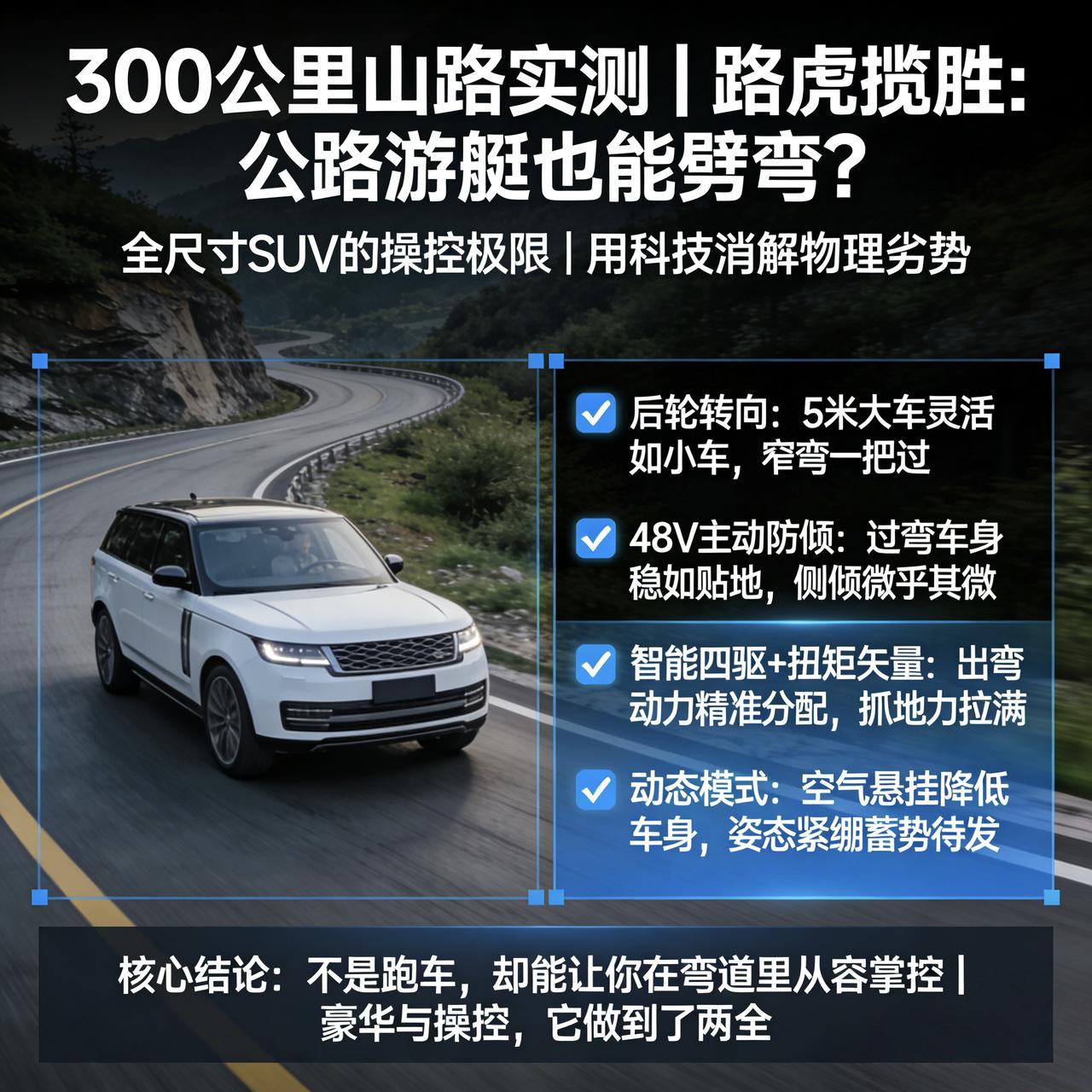 上周,我开着路虎揽胜跑了趟山路,整整300公里。 通常,当我们谈论路虎揽胜时,脑海中浮现的词汇往往是“威严”、“奢华”或是“全地形征服者”。在大多数人的认知里,这台重达两吨半的英伦旗舰,其最佳栖息地应当是行政酒廊的门口或是穿越泥泞的荒野,而非蜿蜒曲折的山路。然而,当我真正握着方向盘,将车头对准这条充满挑战的盘山公路时,我试图寻找的,是这台“公路游艇”在物理极限边缘的真实面目。 这不是一次关于舒适性的巡航,而是一场关于“掌控感”的专项测试。在连续的发卡弯和起伏路面中,我试图剥离掉它豪华内饰带来的感官干扰,纯粹地去感知:当庞大的车身遭遇离心力,当沉重的重心发生转移,揽胜究竟是一头笨拙的巨兽,还是一台被科技武装到牙齿的精密仪器? 测试路段的铺装路面干燥且附着力良好,这为检验车辆的动态响应提供了绝佳条件。入弯前,我将驾驶模式切换至“动态”,空气悬挂自动降低,车身姿态微微下沉,仿佛一位绅士挽起了袖口,准备迎接一场硬仗。 转向手感:物理定律的“欺骗者” 在低速掉头时,揽胜给人的第一印象是“轻”。但这并非那种廉价的虚无感,而是后轮转向系统介入后的直观反馈。在这个狭窄的山路起点,这台全尺寸SUV展现出了令人惊讶的灵活性。后轮与前轮反向偏转,最大可达7度左右,配合精准的转向调校,让这台长轴距SUV在狭窄山路上灵活得不像话。在实际操作中,原本需要“两把甚至三把”才能完成的方向调整,在这里竟然可以一气呵成。这种“虚拟短轴距”的错觉,极大地降低了驾驶者的心理负担,让你忘记了这其实是一台超过5米长的大车。 随着车速提升进入弯道,后轮转向切换为同向偏转模式。此时,方向盘的指向性变得异常精准。在连续S弯中,车头对转向输入的响应几乎没有迟滞。这种“指哪打哪”的沟通感,打破了传统大型SUV转向模糊的魔咒。你不需要像驾驶老式美式轿车那样预留大量的提前量,它的动态响应更像是一台被放大比例的运动轿车,车尾紧紧咬住车头的轨迹,这种循迹性在高速变道时尤为明显,给人一种仿佛在轨道上行驶的安定感。 侧倾抑制:与离心力的“无声博弈” 对于任何高重心的SUV而言,弯道中的侧倾都是无法回避的物理挑战。但在揽胜上,这种挑战被48V主动式侧倾控制系统化解于无形。在通过一个半径较小的右弯时,我刻意保持了较高的入弯速度,身体本能地做好了承受离心力挤压的准备。 然而,预期的车身大幅度倾斜并没有发生。电子防倾杆在毫秒级时间内输出强大的反作用力矩,硬生生地将车身“按”在了路面上。这种体验非常奇妙——你的身体感知到了离心力的存在,但视觉上却看不到车身夸张的晃动。底盘展现出了极高的韧性,既没有像硬派越野车那样生硬地传递路感,也没有像传统豪华车那样像船一样摇晃。它用一种极其从容的姿态,将侧倾控制在驾驶者信心阈值之内。这种“举重若轻”的支撑性,让你在弯道中敢于给油,敢于相信这台庞然大物能够守住预定的行车线。 抓地力反馈:全时四驱的“隐形推手” 出弯阶段是检验操控极限的关键时刻。在湿滑的弯道出口,深踩油门往往伴随着轮胎打滑或转向不足的风险。但在揽胜上,智能全轮驱动系统与扭矩矢量分配系统展现出了极高的介入效率。 当你深踩油门,动力并非简单地粗暴输出,而是被精密地分配给抓地力最好的车轮。这种动力分配过程几乎是无感的,你感觉不到电子系统的突兀介入,只能感受到车身平稳、有力地被“推”出弯道。发动机的动力输出线性且浑厚,变速箱降档果断却平顺。这种抓地力的反馈,给了驾驶者一种极强的掌控感——你清楚地知道车辆的极限在哪里,并且确信电子系统会帮你守住这道防线。它不是在挑战物理极限,而是在用科技手段拓宽物理极限的边界,让驾驶者在极限边缘依然感到游刃有余。 写在最后 经过这300公里的山路实测,路虎揽胜的操控表现彻底颠覆了“大车无操控”的刻板印象。它并没有试图将自己伪装成一台跑车,而是通过顶尖的科技手段,消解了尺寸和重量带来的物理劣势。 它的操控哲学并非追求极致的圈速或激进的驾驶乐趣,而是致力于提供一种“可控的从容”。它让驾驶者在面对这台庞然大物时,不再感到恐惧或笨拙,而是感受到一种尽在掌握的自信。这种将“豪华舒适”与“动态掌控”完美融合的能力,或许正是揽胜作为全尺寸SUV标杆的真正实力所在。它证明了,只要科技足够强大,游艇也可以在弯道上起舞。【来自懂车帝车友圈】