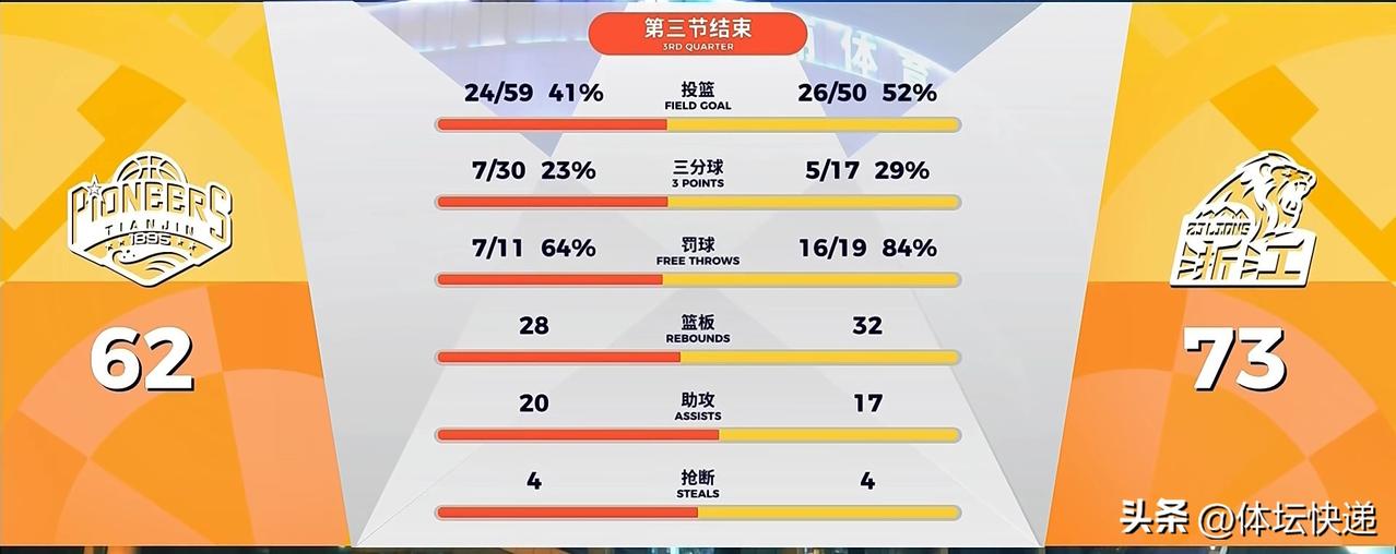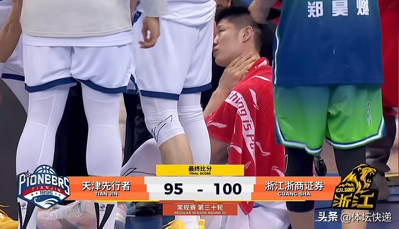 浙江浙商证券客场小胜天津先行者。浙江浙商证券受伤病困扰,孙铭徽,布朗,卡尔顿作壁上观。只能俩外援出战。天津先行者一直为季后赛努力,坐镇主场实力不容小觑。首节开始,天津先行者率先发难,比分迅速拉开。浙江浙商证券不急不躁,慢慢追回分差。天津先行者叫暂停。暂停回来,天津先行者逐步缩小分差。首节结束,天津先行者21:22浙江浙商证券。次节开局双方比分交替领先。随后天津先行者命中率下降,浙江浙商证券趁机扩大分差,天津先行者叫暂停。暂停回来,天津先行者进攻依旧艰涩,分差来到两位数。随后天津先行者手感回暖,缩小分差。王博指导叫暂停。暂停回来,双方互有攻守。半场结束,天津先行者41:52浙江浙商证券。易边再战,天津先行者连续高炮台命中,分差缩小到个位数。浙江浙商证券放缓进攻节奏,稳定局面。天津先行者连续高炮台命中,再次缩小分差。赵嘉仁高炮台命中,分差再次来到两位数。三节战罢,天津先行者62:73浙江浙商证券。末节开局,浙江浙商证券内外开花,进一步扩大分差。天津先行者手感回暖,咬住比分。天津先行者外线频频得分,分差缩小到个位数。王博指导叫暂停。暂停回来,林秉圣连续外线命中,稳定局面。天津先行者及时予以回应,王博指导再暂停。暂停回来,浙江浙商证券顶住了天津先行者的疯狂反扑,以100:95险胜。大秋最后时刻被詹姆斯侵犯,受伤倒地。