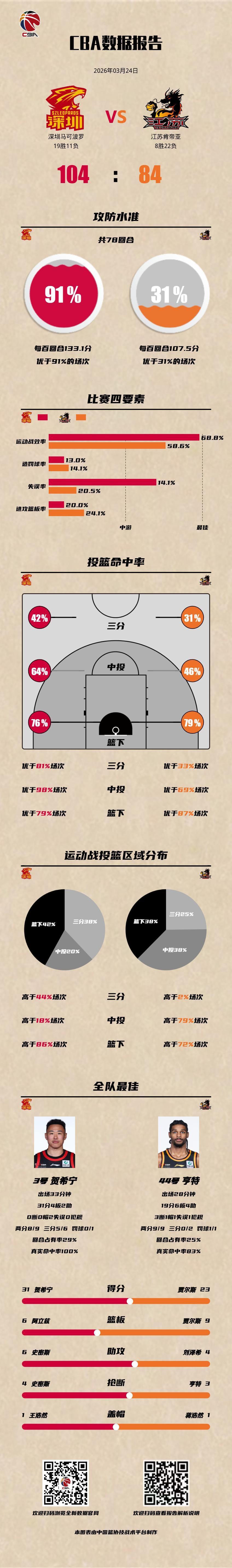 深圳马可波罗 104-84 江苏肯帝亚 深圳男篮vs江苏男篮 深圳马可波罗:贺希宁31分4篮板,阿立兹20分6篮板,史密斯13分6助攻4抢断; 江苏肯帝亚:贾尔斯23分9篮板,亨特19分6篮板4助攻3抢断,斯塔克斯12分。以城之名