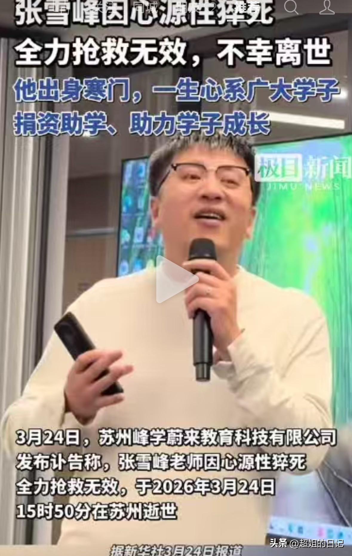 苏州蔚来教育科技有限公司发布讣告, 张雪峰老师因为心源性猝死,于2026年3月24号下午15点50,于苏州经抢救无效去世。 消息一经证实,几百万他的粉丝纷纷发文悼念。之前大家都希望这是假消息,没想到,才41岁的他,上午还在直播,下午人就这样匆匆走了,一句话没留下。 希望他一路走好吧。