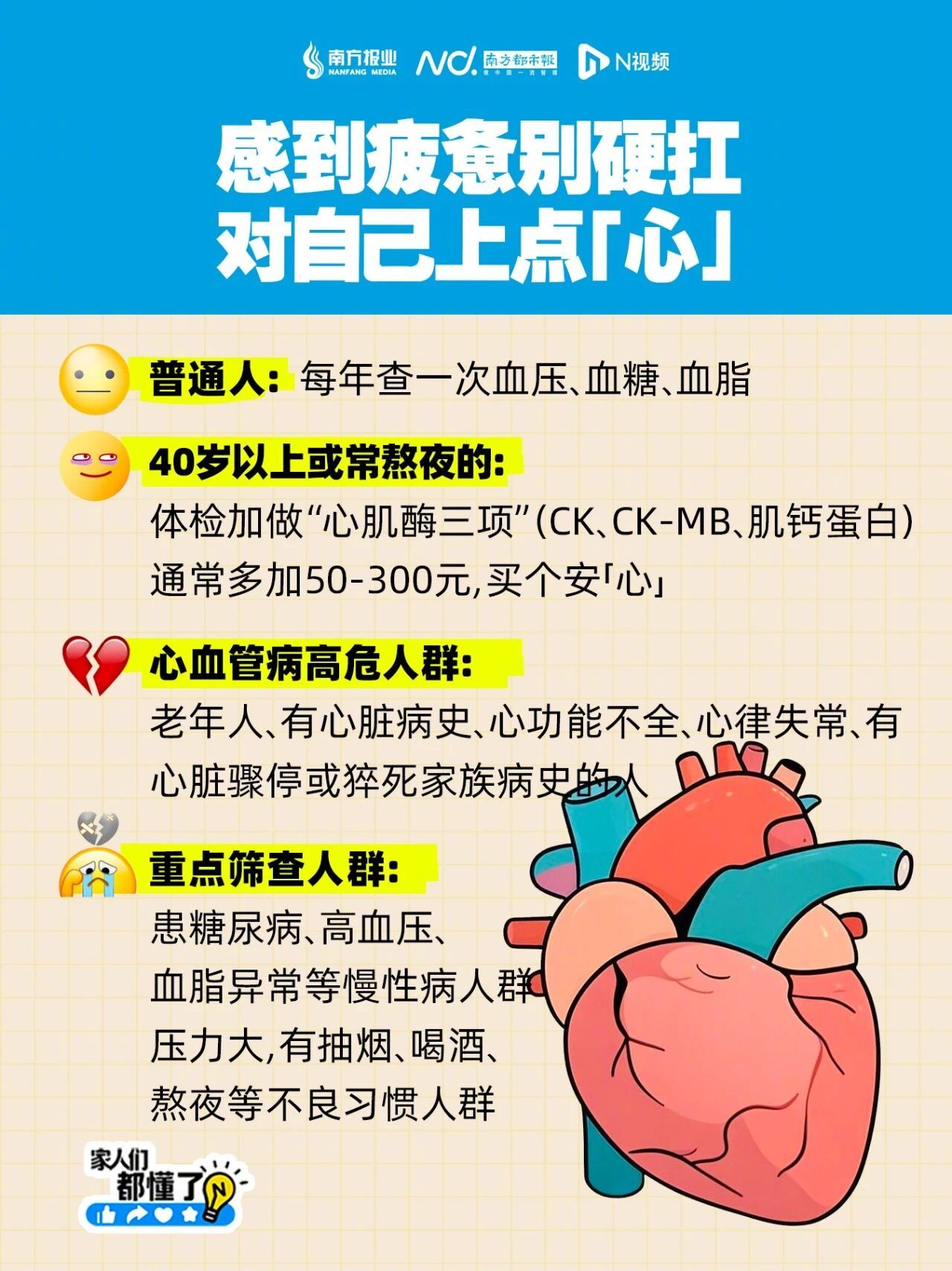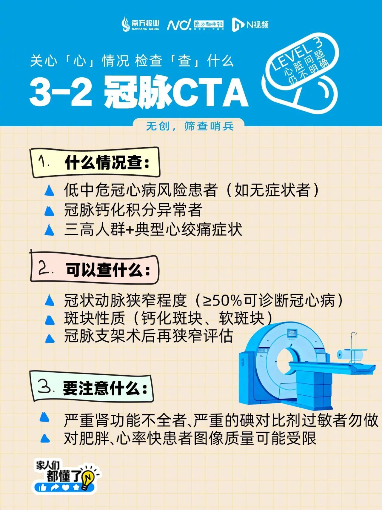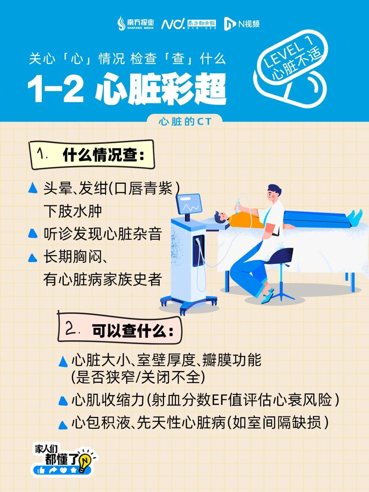 怎么查、查什么:💔 心脏不适🩺 可做【心电图】【心脏彩超】【运动平板】⬇️💔 心脏不适症状持续或高危🩺 可查【血液生化】⬇️💔 心脏问题仍不明确🩺 可做【核磁】【冠脉CTA】⬇️💔 仍需最终确诊🩺 可做【冠脉造影】* 详情参考上方图片,检查前请详询医生并遵医嘱📢 上点心!转发提醒家人!南方都市报(nddaily)报道