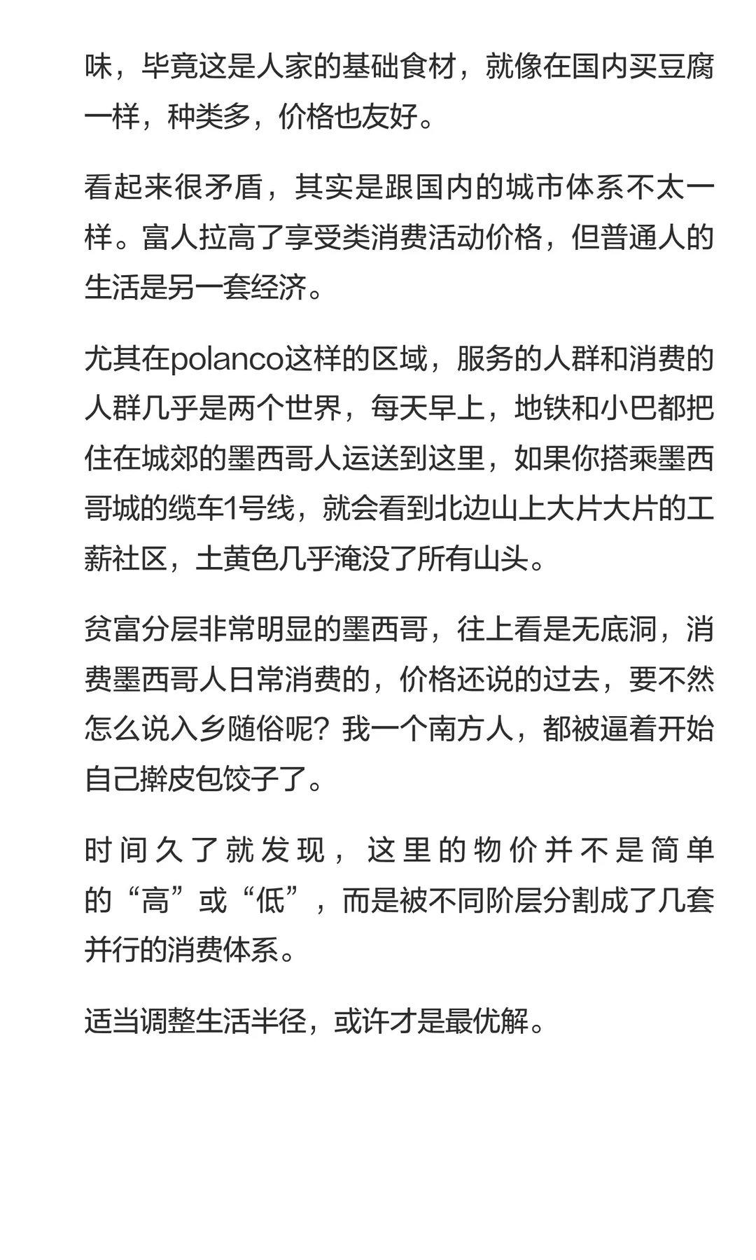 墨西哥的消费并非单纯“贵或便宜”,而是被阶层切割成几套并行体系——享乐型消费价格高企,日常生存成本相对可控。人工服务便宜,但商品、品牌和进口品普遍偏贵。
