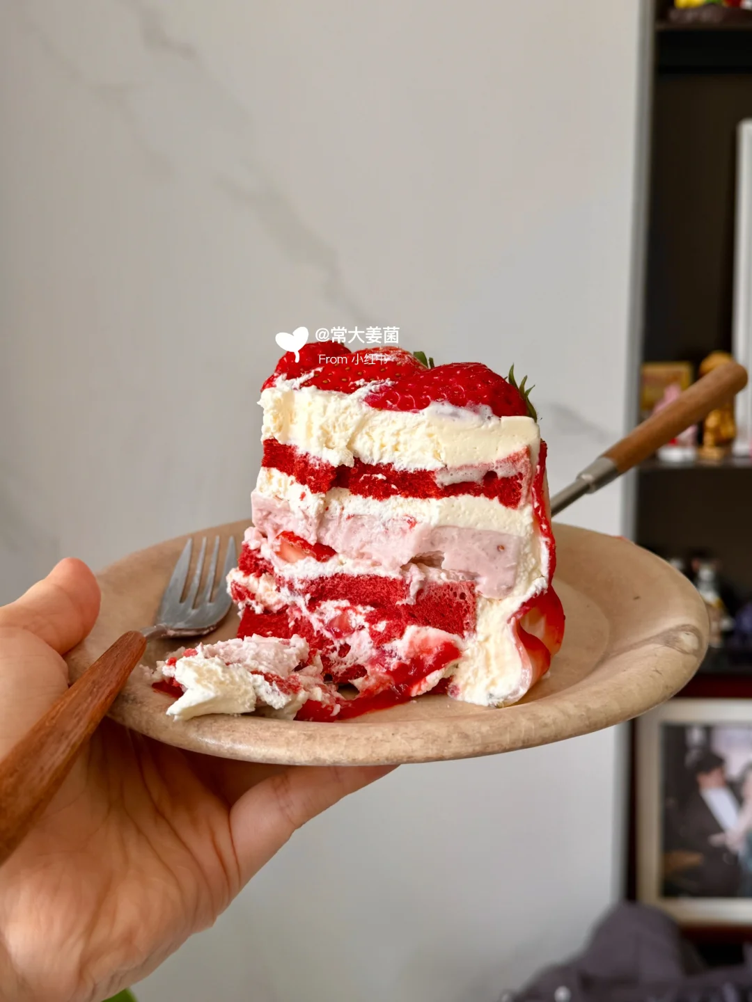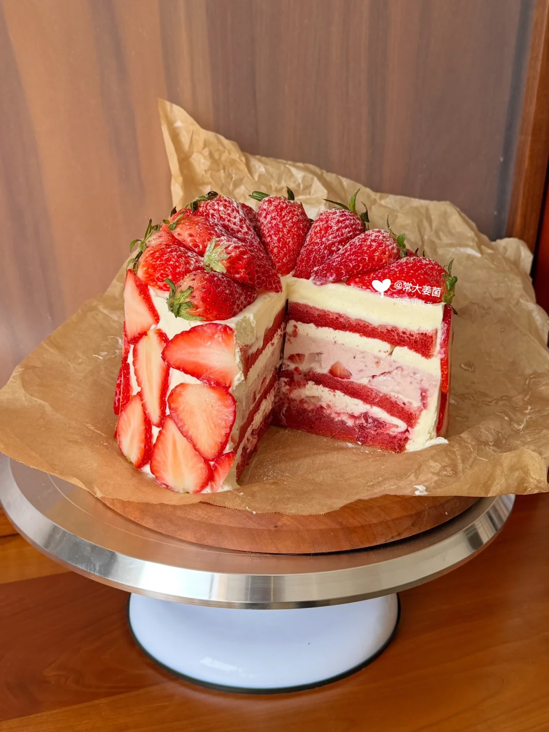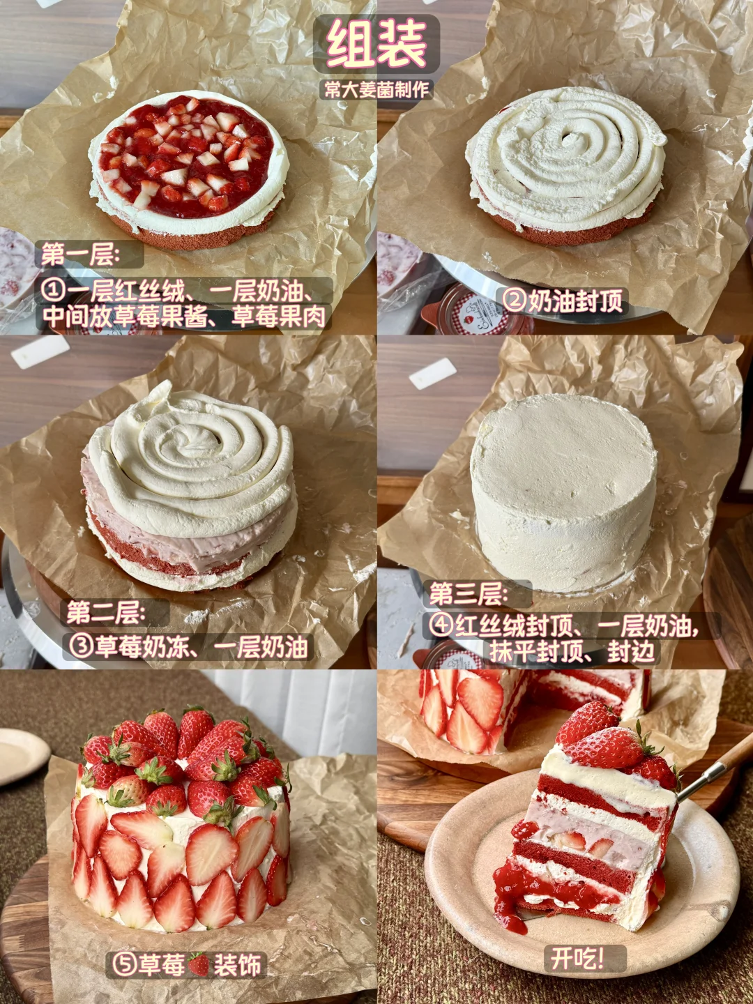 草莓蛋糕🍓🍰真是一款果香味很突出的蛋糕!! 草莓元素: ①每次买了草莓都是先熬果酱👩🏻🍳密封后放冰箱待吃☺️ ②拿出一部分果酱再做出草莓奶冻 ③草莓切片做装饰 以上操作把草莓香气完美突出,搭配加入了马斯卡彭的奶油(奶香味好浓♨️)芜湖,来一杯咖啡或者茶,尊是不错!