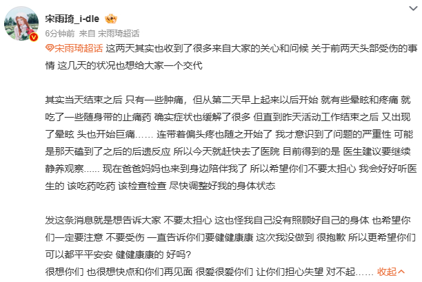 宋雨琦回应头受伤宋雨琦回应身体不适 宋雨琦回应活动时身体不适,表示之前头受伤后只