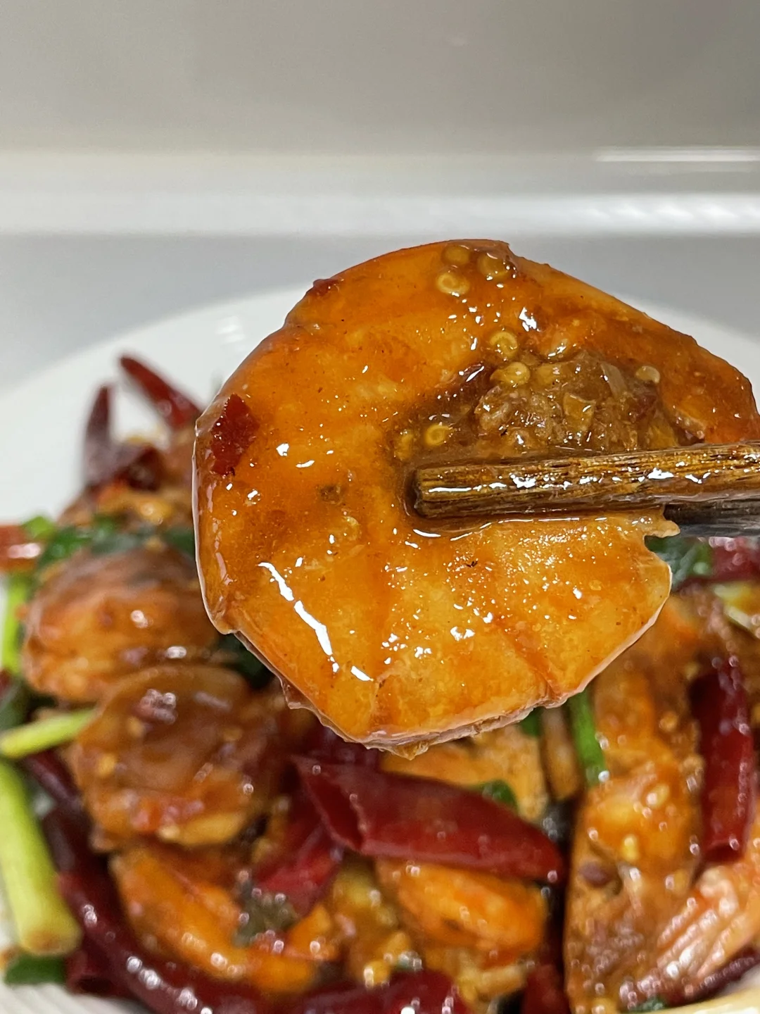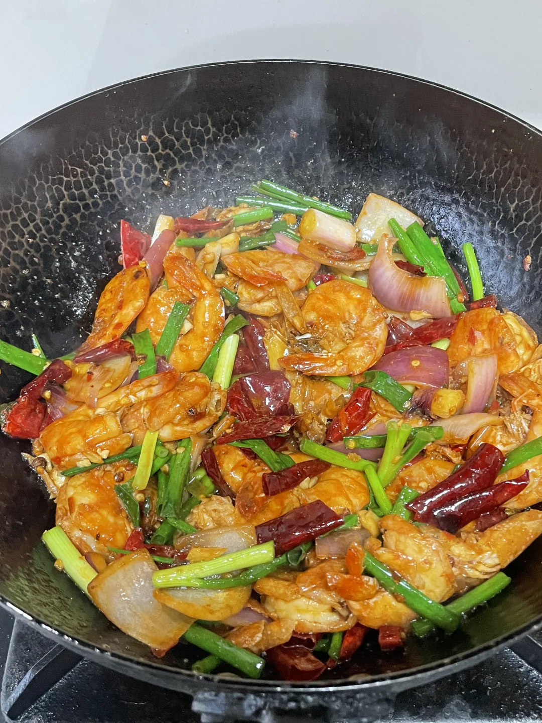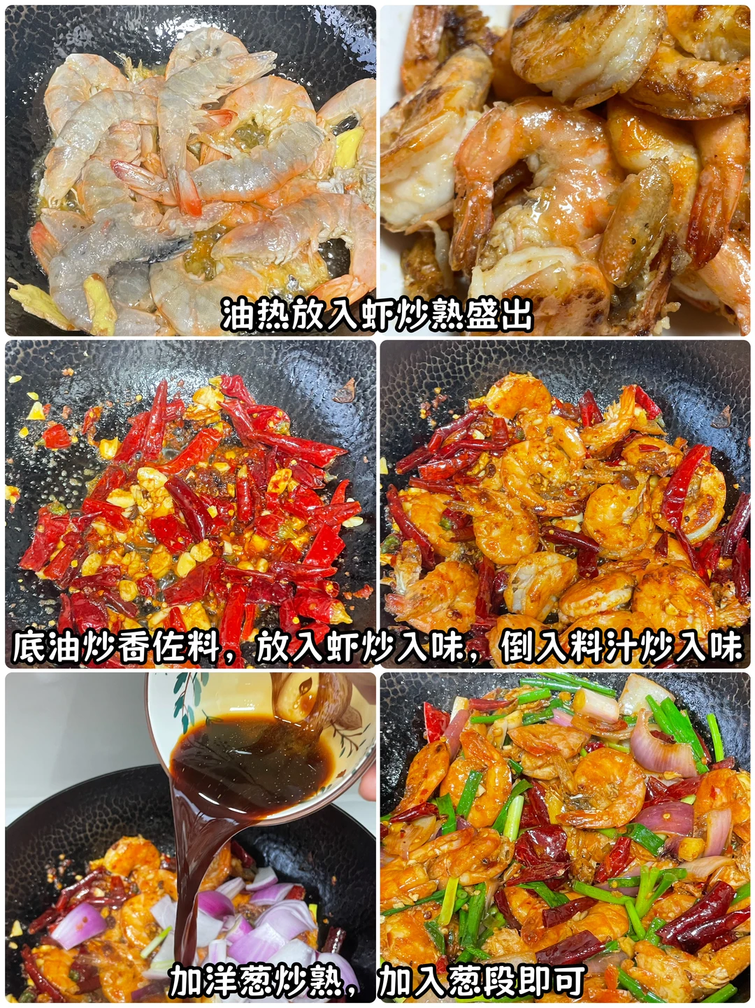 3⃣️起锅烧油,油热将虾放入锅中炒熟盛出,锅里的底油,炒香豆瓣酱、干辣椒、花椒、蒜。然后放入虾炒入,炒进味,再加入料汁,让每一个虾都充分的吸入汤汁,再放入洋葱炒断生,加入葱段即可出锅。这样做出的香辣虾既简单又家常还好吃