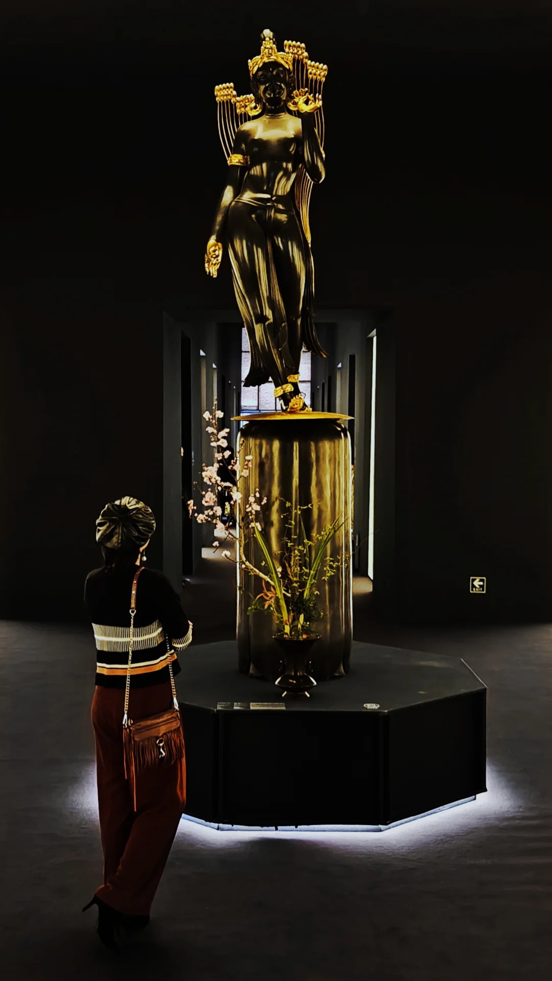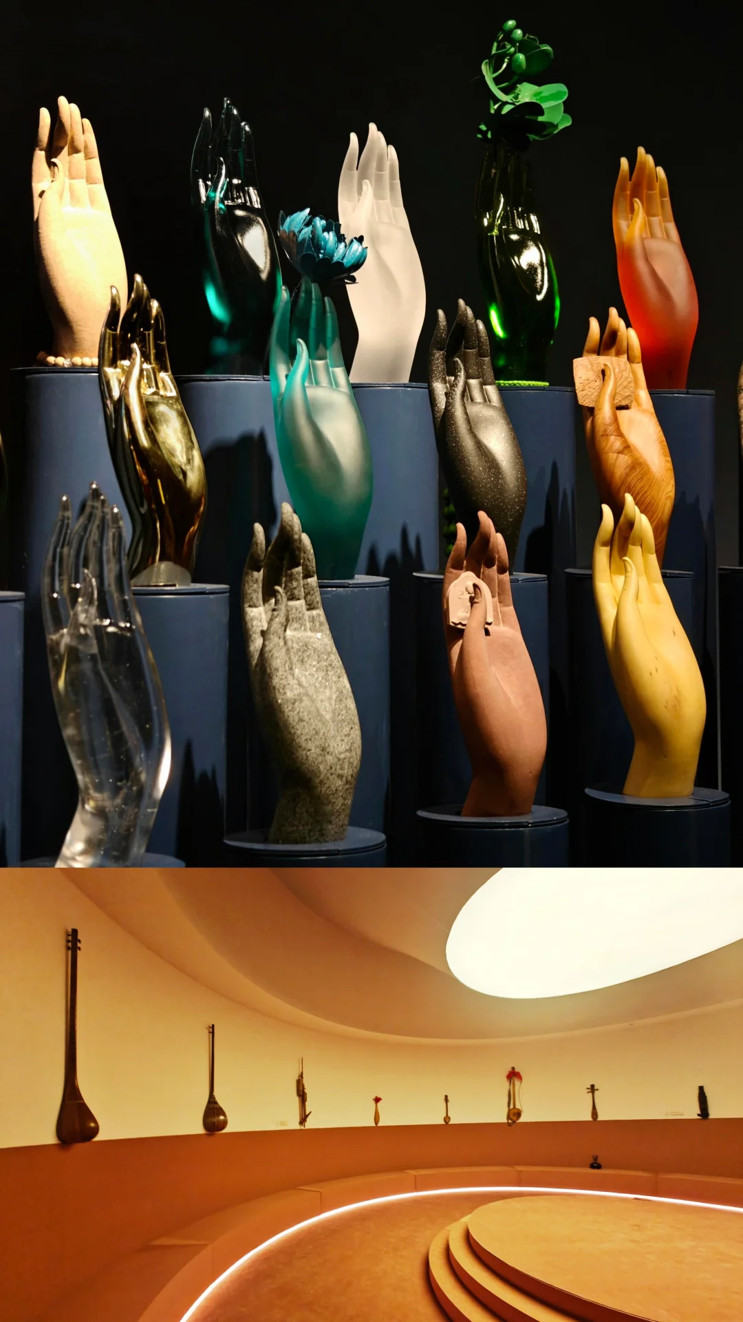 从1000+非遗代表性项目中选出的有代表性的10个,包括汪氏皮影、徽州木雕、软木画、苗族银冠、花丝镶嵌团扇等。展厅中央的弥勒菩萨青铜立像超级吸睛,是雕塑家蒋晟的作品,前方供奉的古立花则插在明代花瓶中。