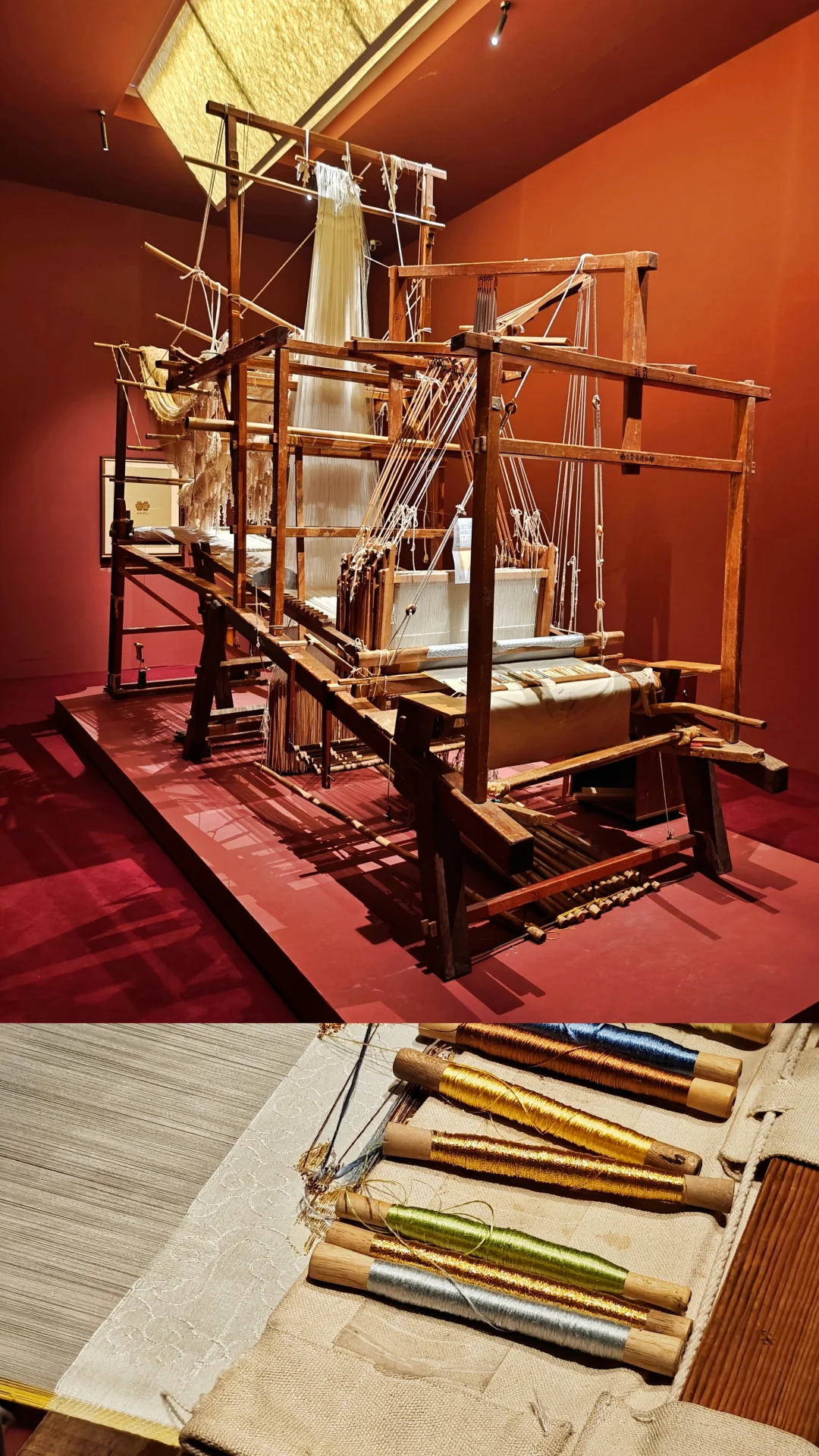 镇展级重磅展品:南京云锦研究所带来的云锦大花楼木织机,定型于明代,和《天工开物》中绘制的花机图部件、结构完全一致,由1924枚纤木构件以榫卯咬合而成,至今仍可用于织造云锦中最复杂的“妆花”品种。古代皇帝的龙袍便是通过这台织机的“通经断纬”技艺织造而成,是3000多年织锦史中唯一不能被现代机器完全取代的非遗技艺。