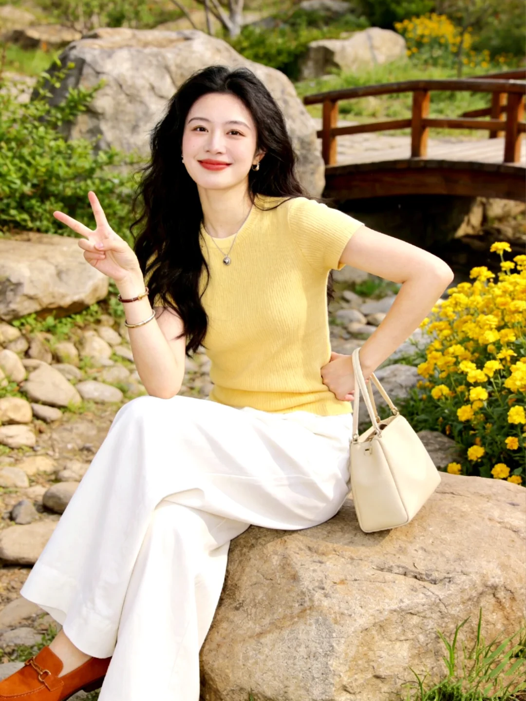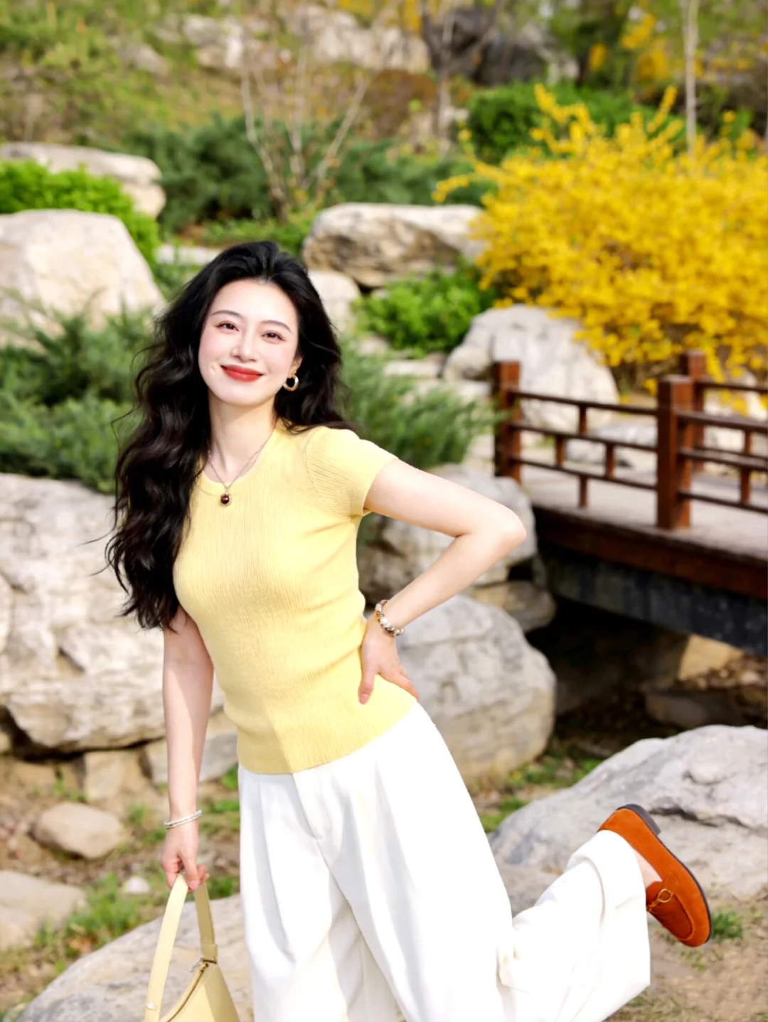奶黄色 黄色系 针织衫 白色裤子 春暖花开温柔风穿搭 温暖明亮色系 温柔穿搭风 奶油风