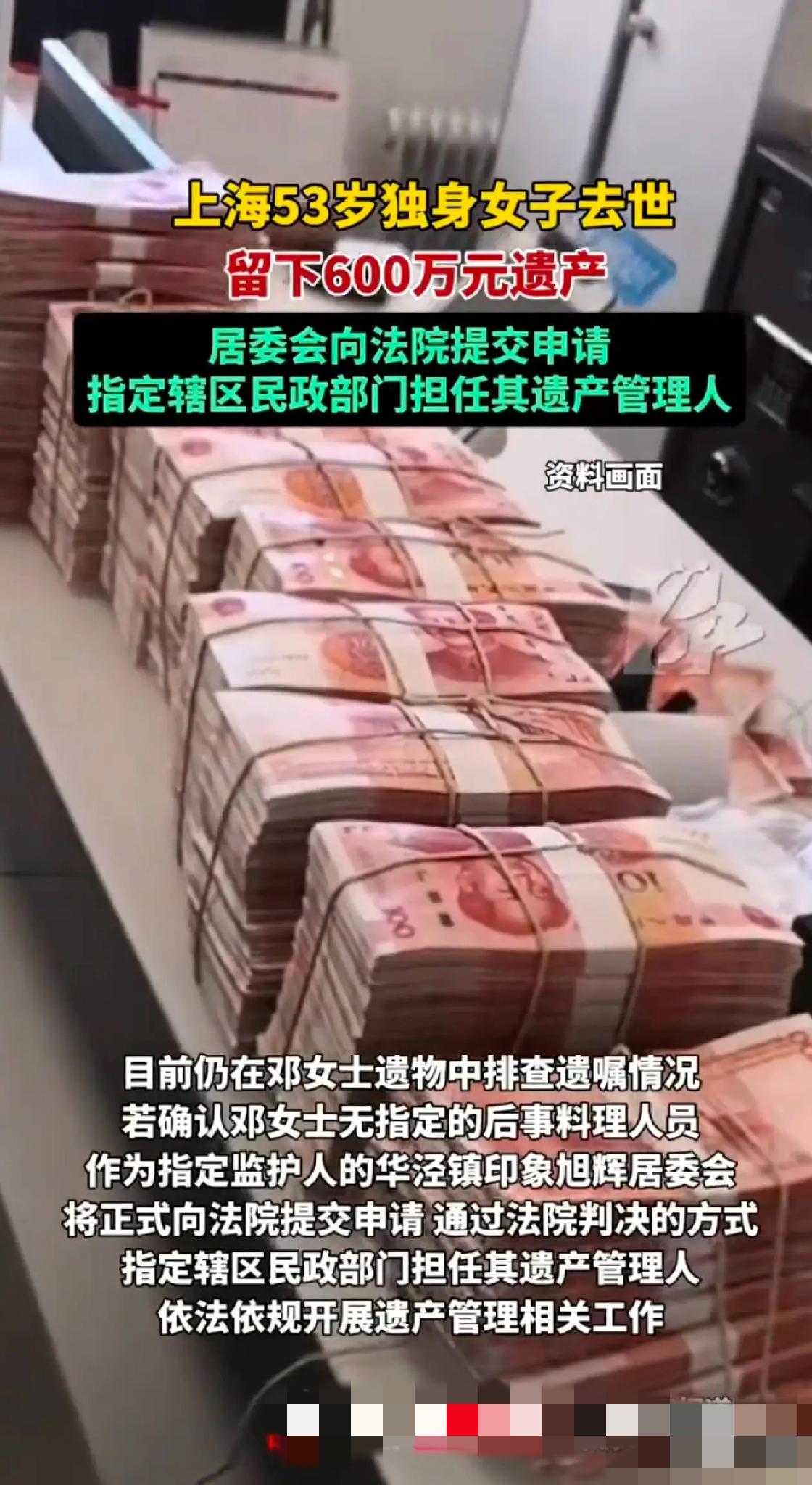 上海一名53岁独居女子离世,其父母早逝,一生未婚未育。令人唏嘘的是,她账户内竟留有近600万元拆迁补偿款。此事引发社会广泛关注,目前相关部门正核查遗嘱。若无人继承,这笔遗产将依法收归国有,用于公益事业。