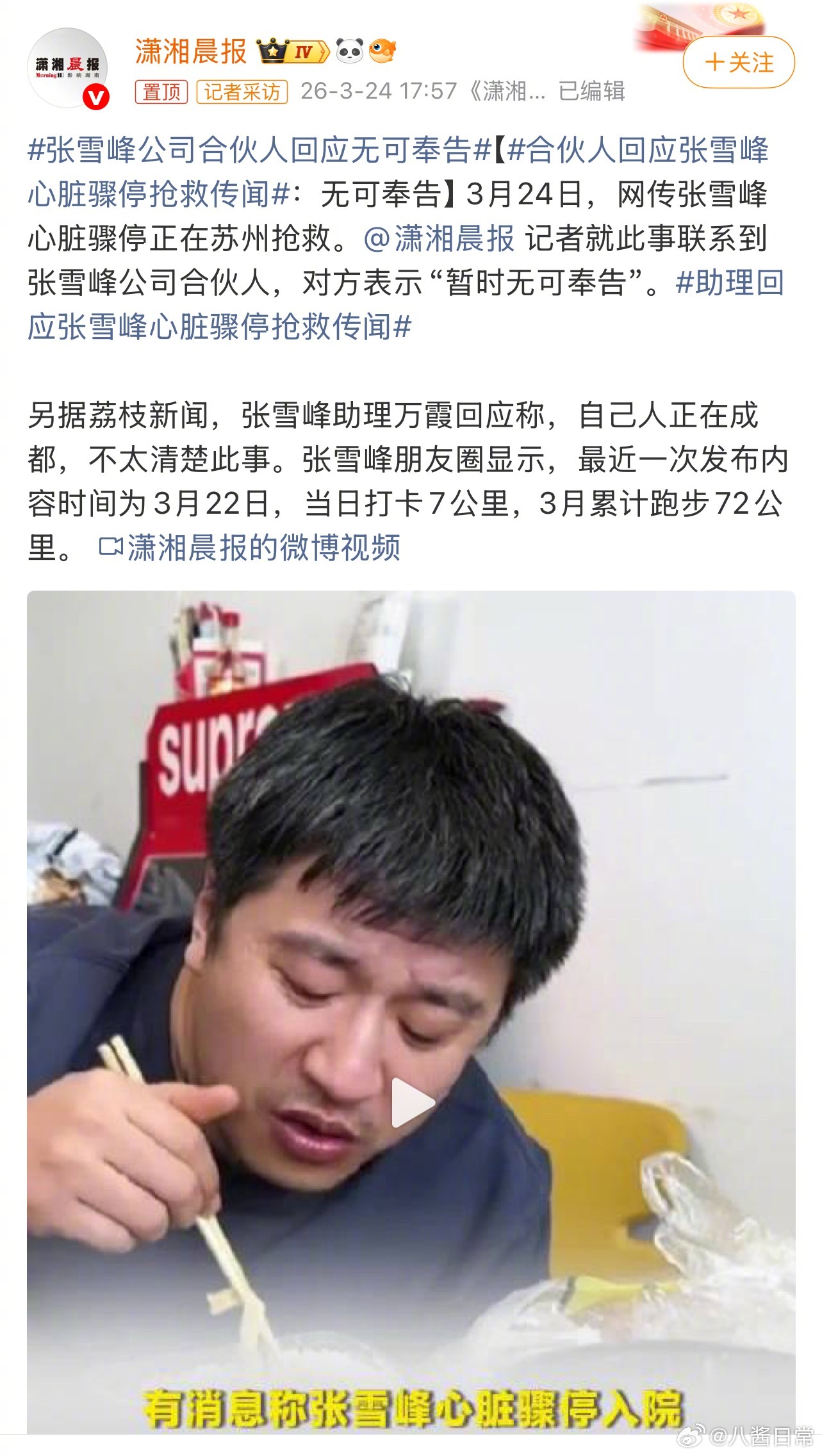 张雪峰曝张雪峰进ICU,知情人曝其在跑步机上心梗……网传张雪峰是熬夜加健身,在