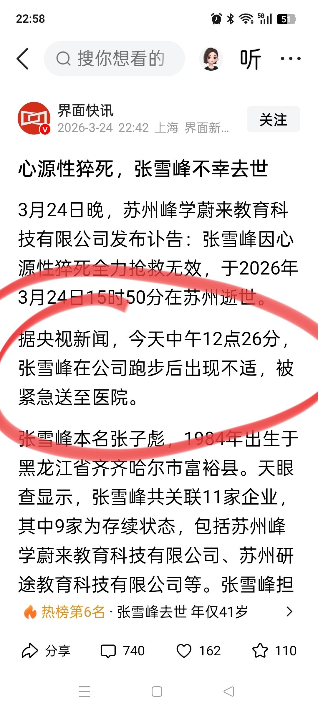 张雪峰走了, 有很多网友说是因为跑步过量导致! 事实并非完全如此! 因为有消息,张雪峰今天是在公司跑步,出现不适的,而且是接近中午的时间,12点26分。这个时间段一般人都会选择慢跑,不会上强度。 我也特意查了下,张雪峰老师在2023年,就因为过度劳累,胸闷住院了。 说明他的工作强度一直还挺大的,且有时候还熬夜,生活作息不规律,跟跑步关系不大。 一路走好,张雪峰老师[祈祷][祈祷][祈祷]