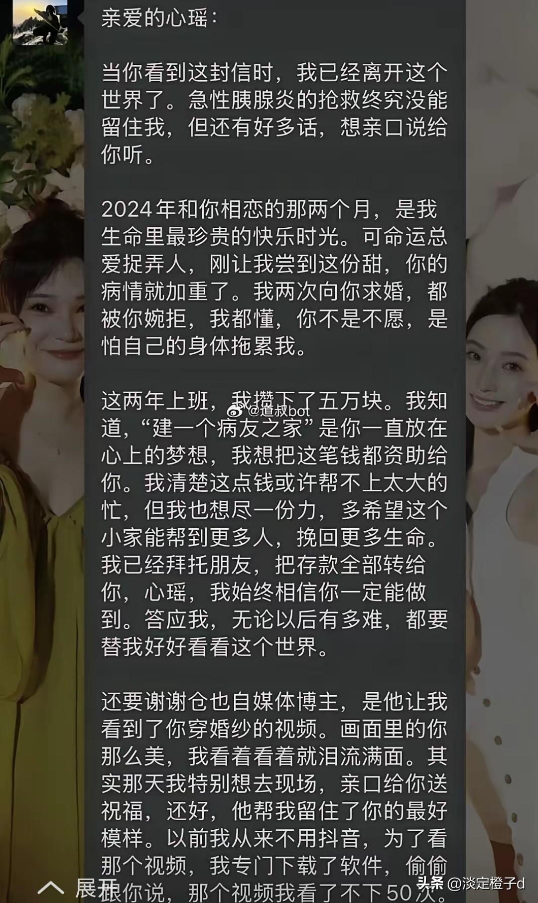 身世与遗愿破防 胡心瑶地铁擦血藏满心酸过往。 新观点。教养与深情不被病痛消磨。03年生的胡心瑶患血管炎,病症像体内乱撞的小风暴。3月23日重庆地铁1号线消化道出血,她脱外套擦净血渍,不扰旁人。 小困惑。吐血与罕见血管炎直接相关,消化道受病症影响引发出血。她怕弄脏车厢扰人,才用衣物清理。 情绪共鸣。双向奔赴的爱意最走心。2024年她与辅警男友相识,男友两次求婚,她怕拖累拒绝。男友突发胰腺炎离世,留5万元帮她建病友之家。 最新进展。胡心瑶已按意愿离开华西医院,病情暂稳。病友之家筹备推进,社会帮扶持续到位。两人实打实的深情,让不少网友瞅着破防。 你怎么看这份克制又滚烫的温柔。