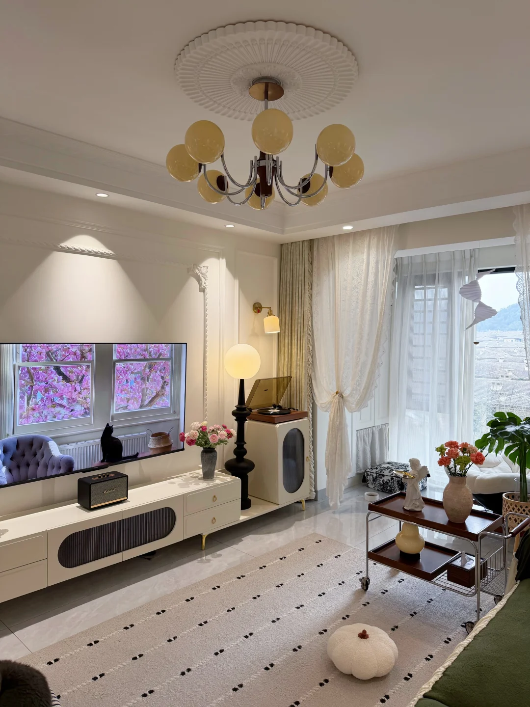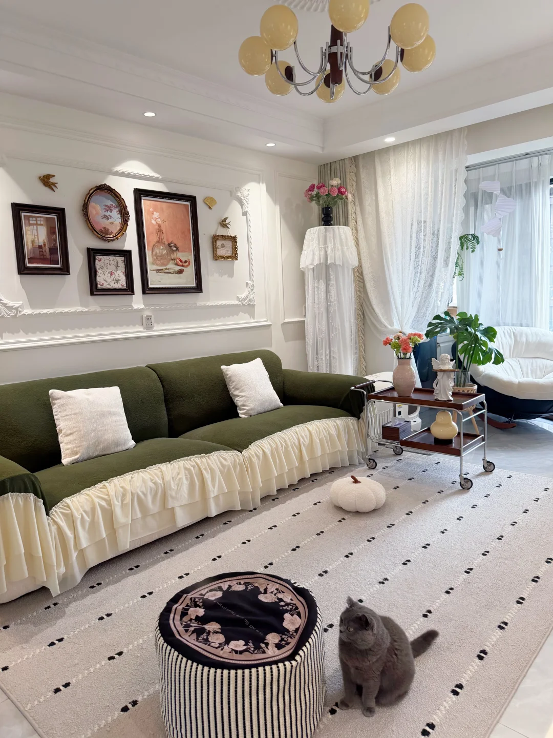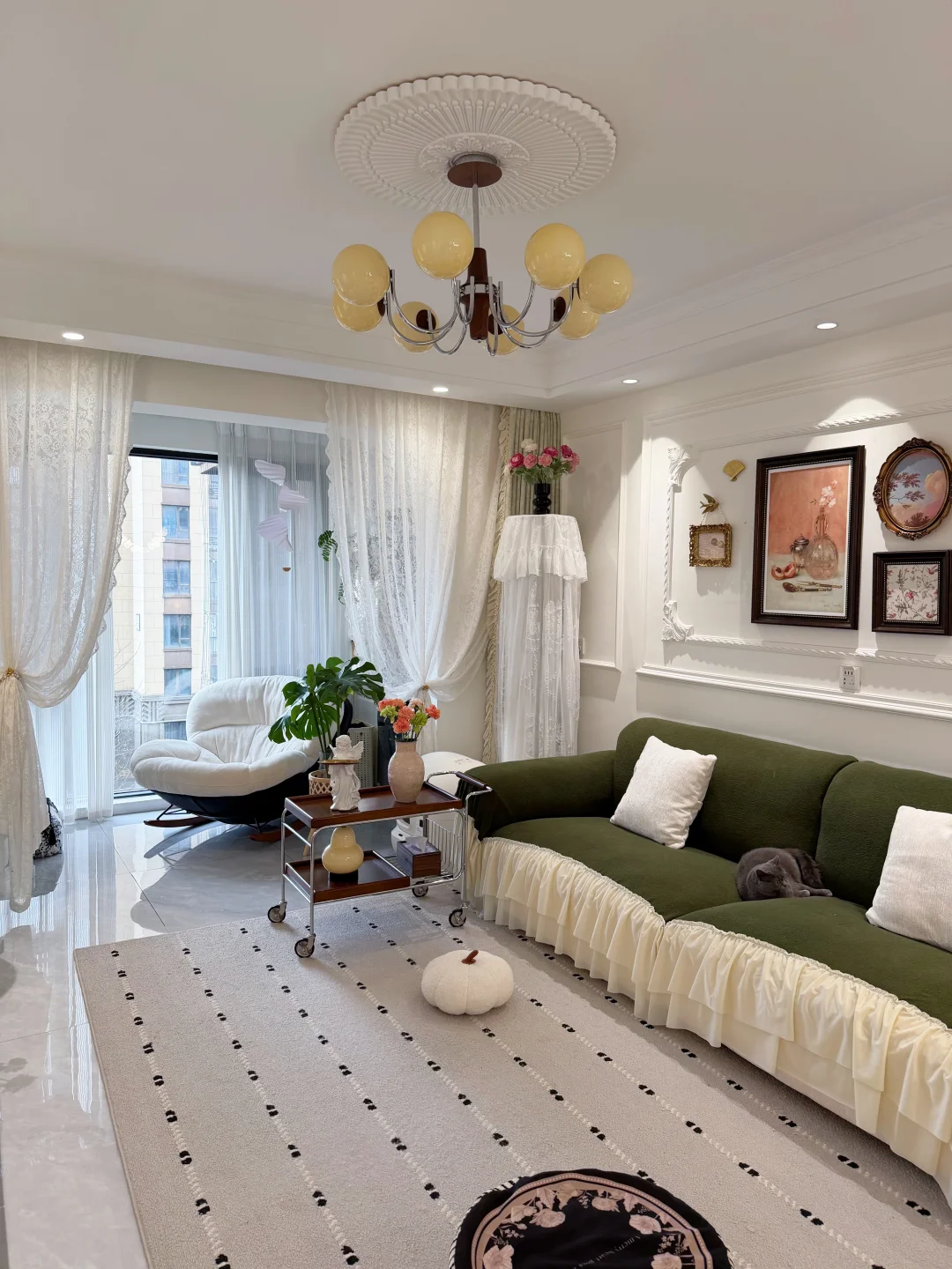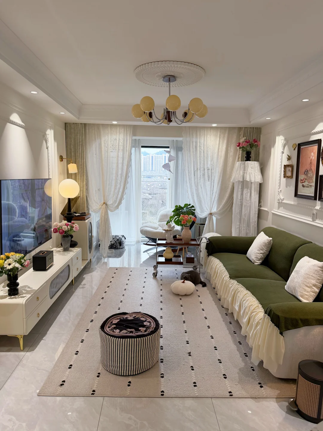 套内90平的普通小家 没有复杂硬装,只靠软装慢慢搭成喜欢的样子✨ 法式轻复古的温柔感 黑白绿咖的低饱和配色 真的越看越耐看~ 放弃了传统茶几 换了地毯和舒服的直排沙发 空间显大又自在 风一吹纱帘,氛围感直接拉满 再摆上绿植和鲜花 日子一下子就温柔起来 小户型也能拥有属于自己的浪漫🌿