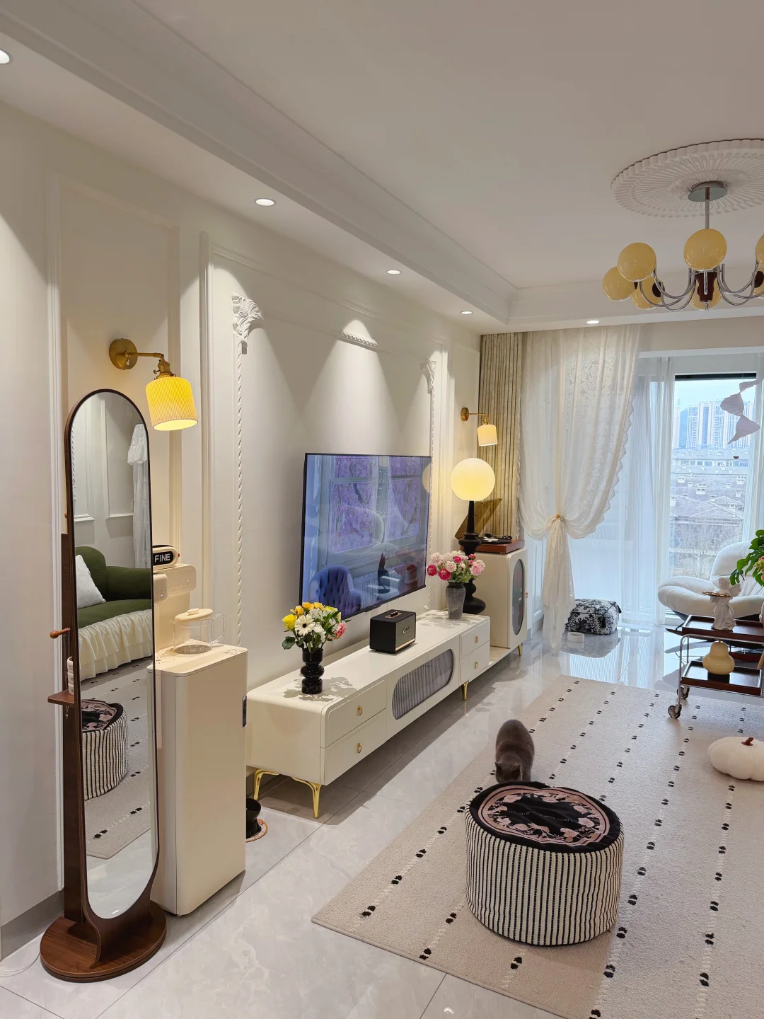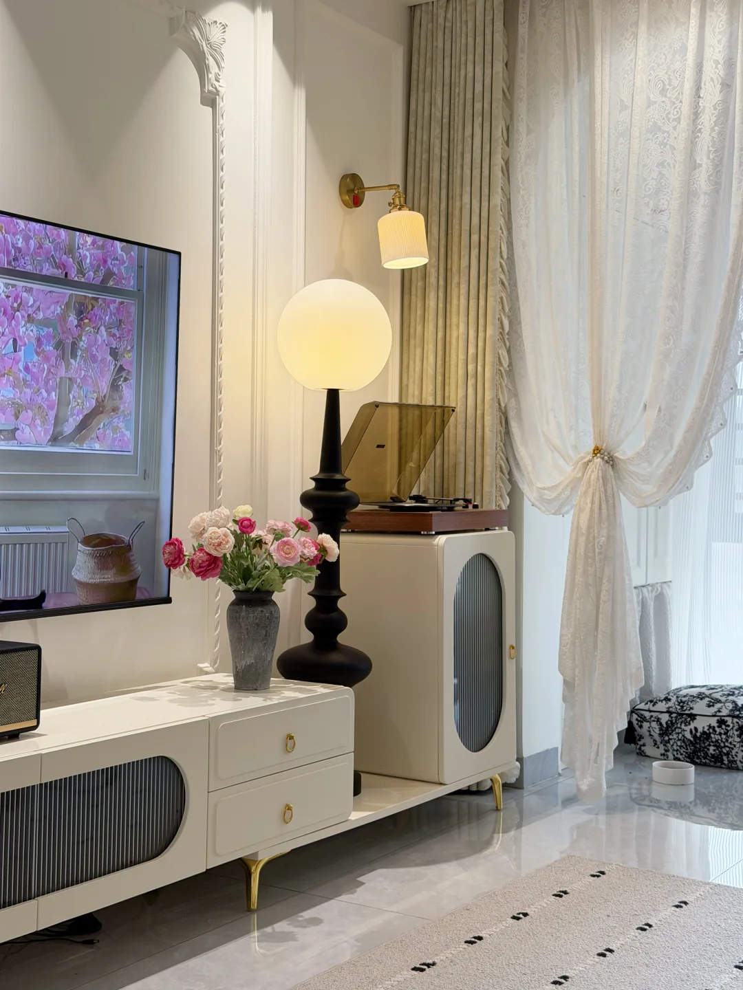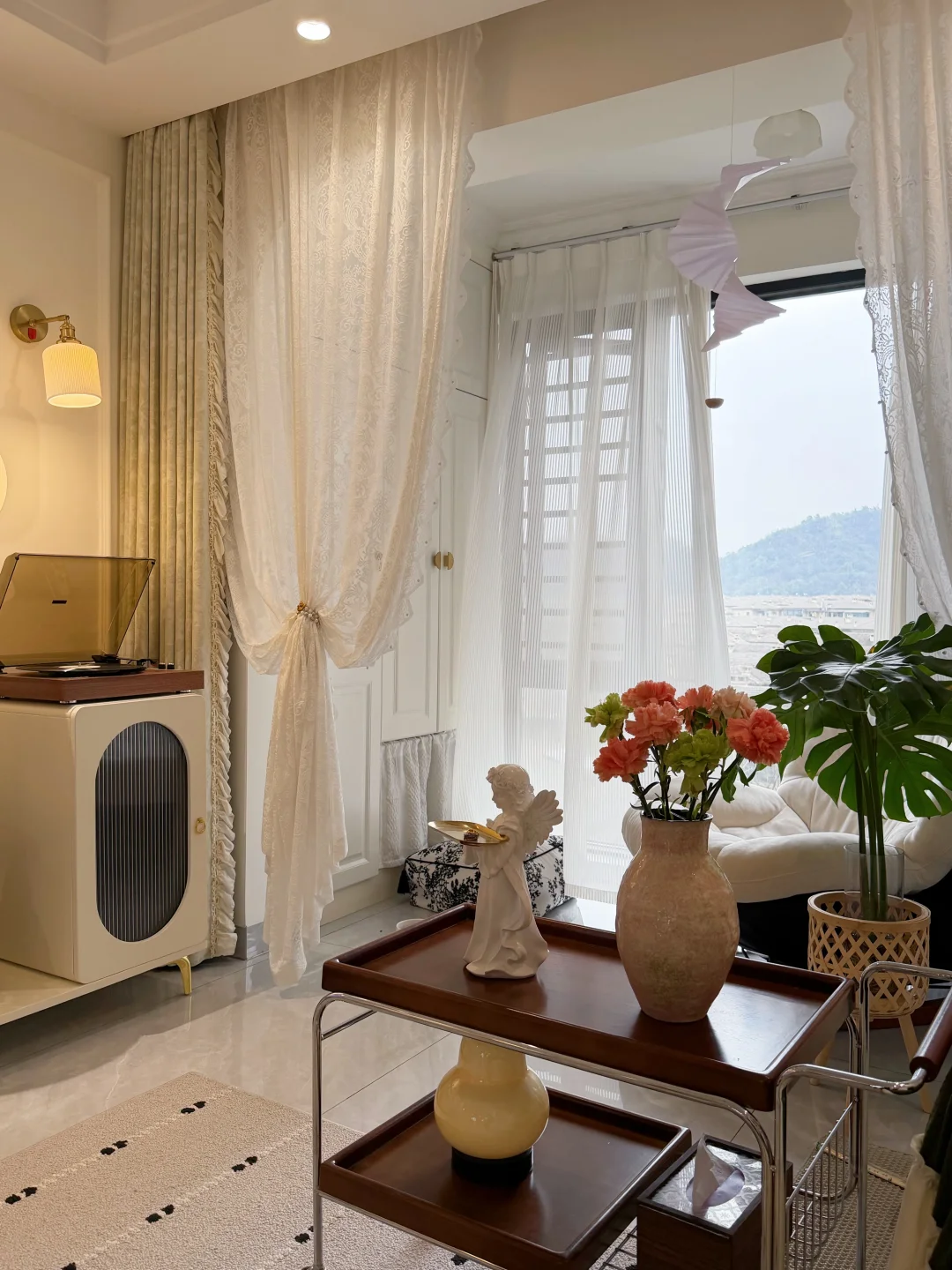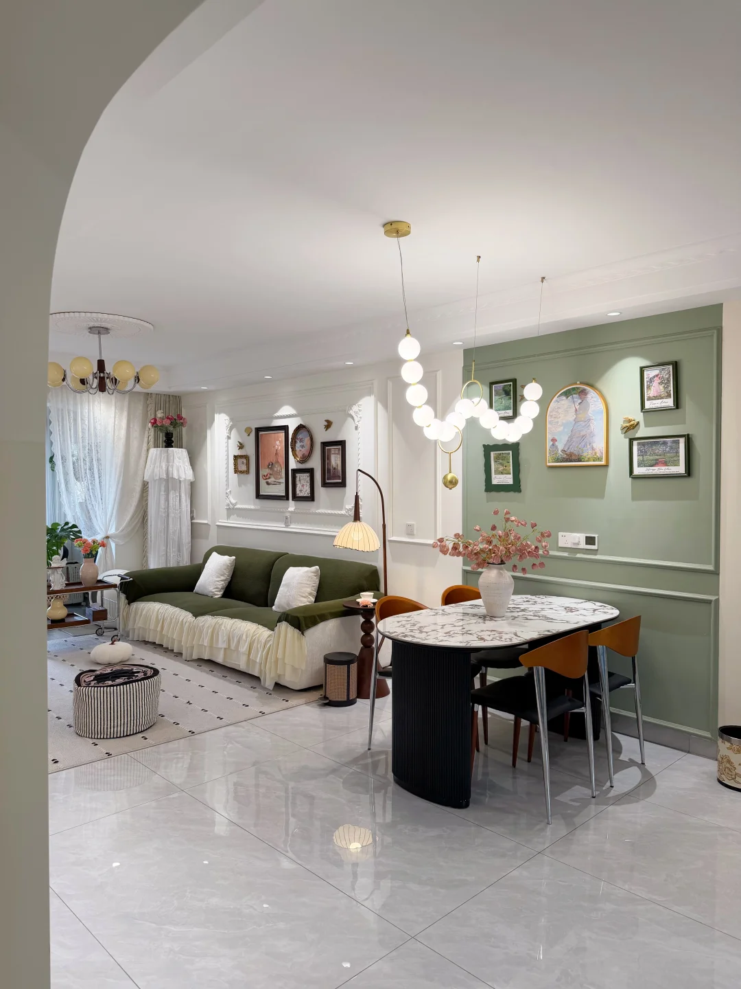 套内90平的普通小家 没有复杂硬装,只靠软装慢慢搭成喜欢的样子✨ 法式轻复古的温柔感 黑白绿咖的低饱和配色 真的越看越耐看~ 放弃了传统茶几 换了地毯和舒服的直排沙发 空间显大又自在 风一吹纱帘,氛围感直接拉满 再摆上绿植和鲜花 日子一下子就温柔起来 小户型也能拥有属于自己的浪漫🌿