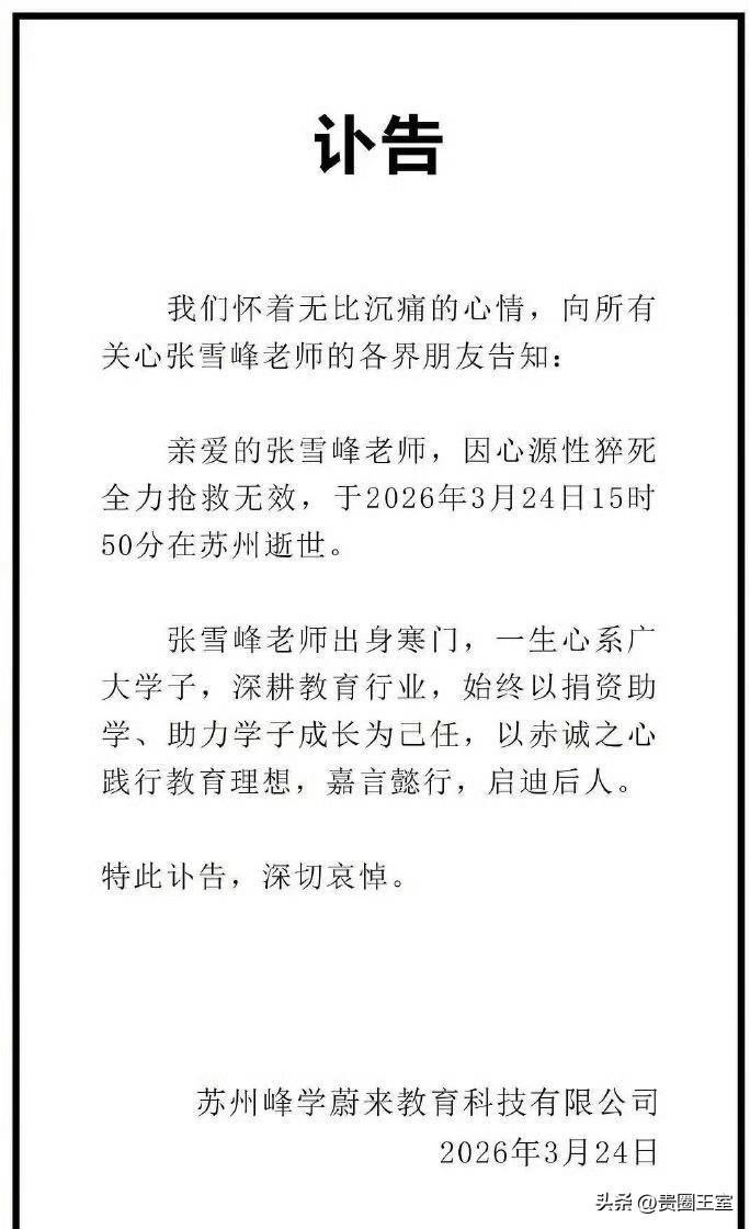张雪峰老师朋友圈签名“中年创业狗”,只可惜这个“中年”,再也无法更改。 张雪峰老师朋友圈签名“中年创业狗”,道尽了成年人的无奈与坚韧,这份自嘲背后,是常人难以想象的高压与奔波。即便早已功成名就,他依旧不敢停歇,始终在为学子、为事业奋力向前。 讣告发布,全网震动。张雪峰老师的社交账号头像瞬间变灰,无数人不愿相信这突如其来的噩耗,直到官方回应,才不得不接受残酷现实。 张雪峰老师于2026年3月24日15时50分在苏州逝世。 我们所了解的张雪峰老师出身寒门,一生心系广大学子,深耕教育行业,他的逝世让每个人都心痛和惋惜。🙏🙏