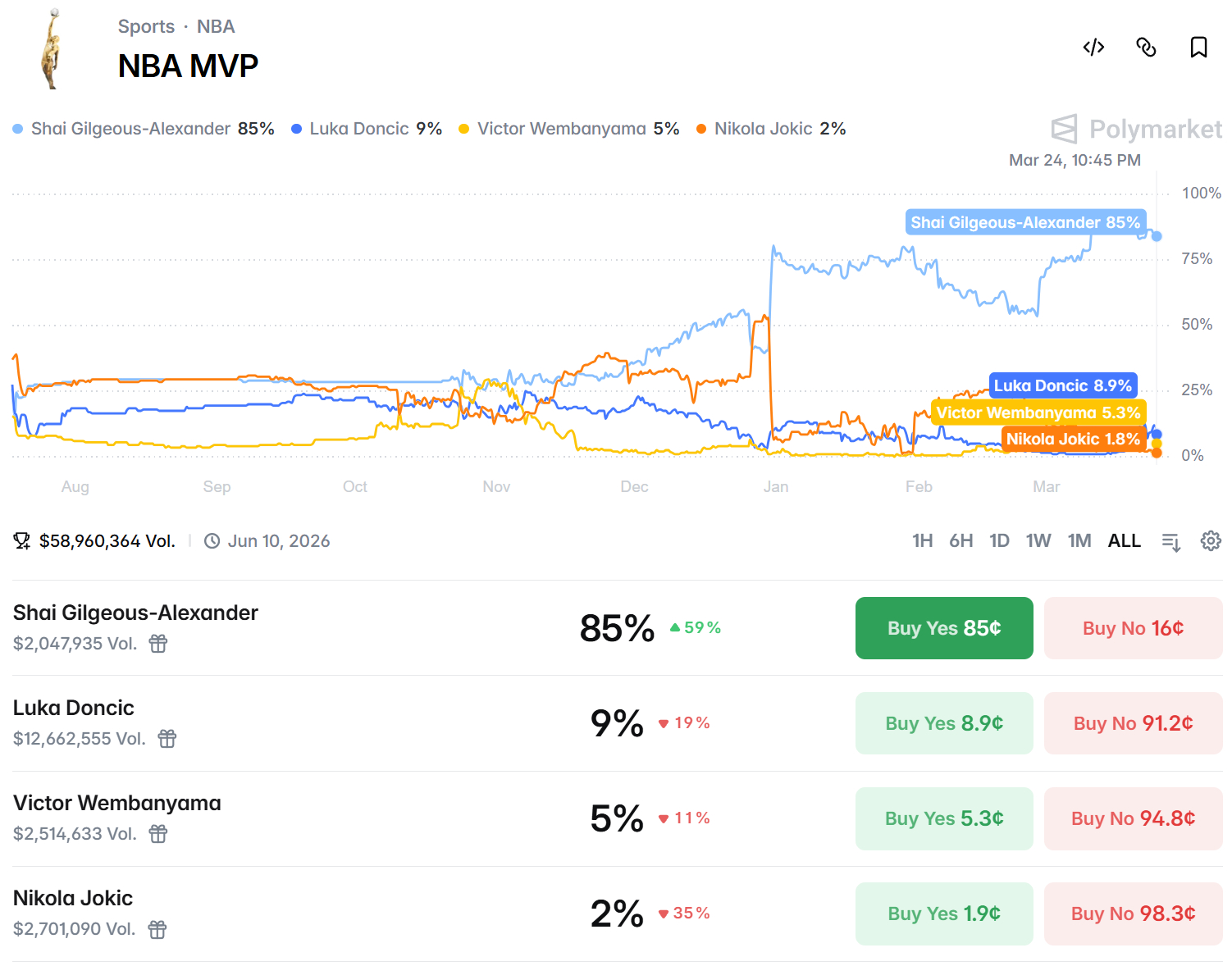 Kalshi和Polymarket实时NBA本赛季MVP赔率,亚历山大碾压式领跑