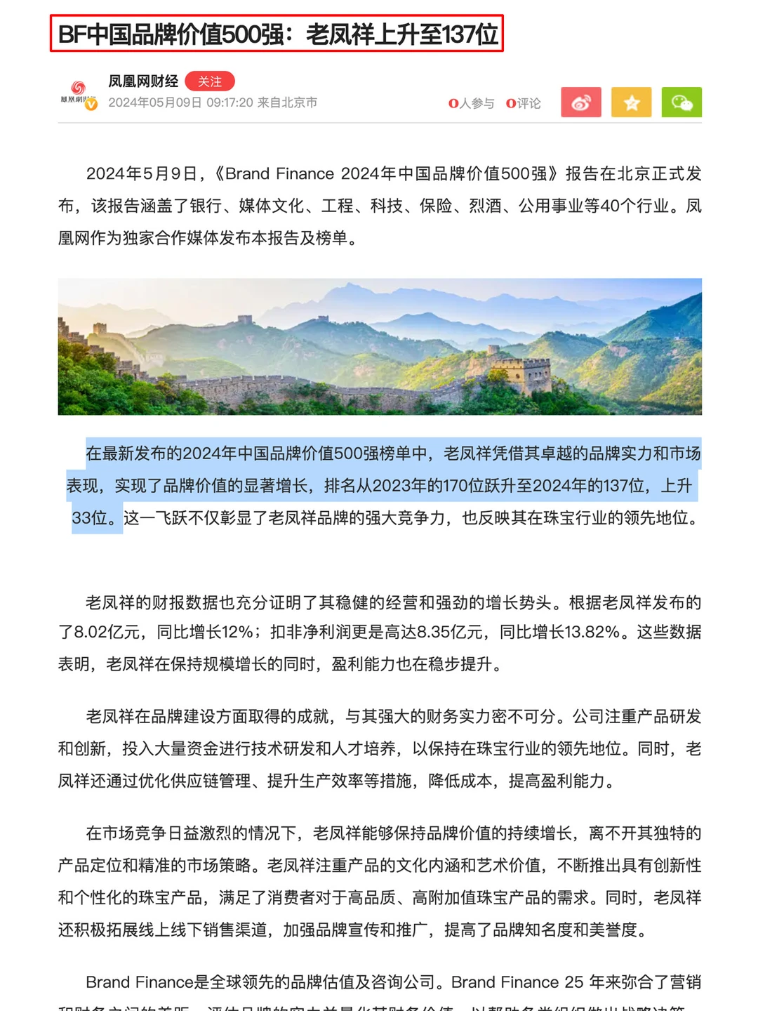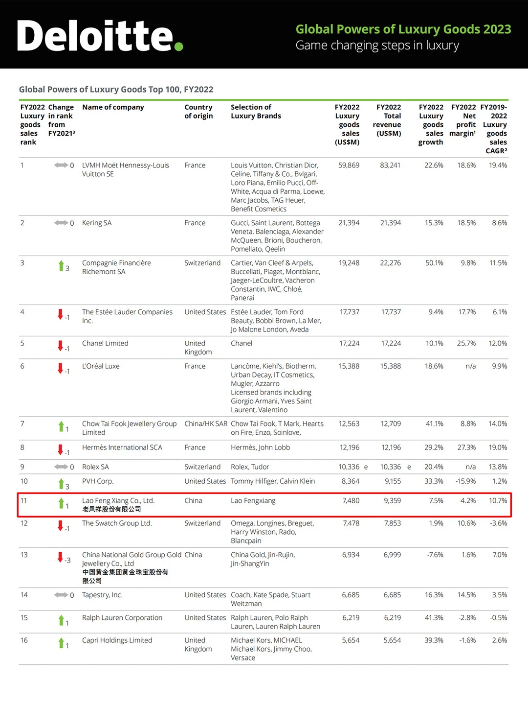 ✍️在德勤(就是那个全球四大会计师事务所之一的Deloitte)发布的《全球奢侈品力量百强》榜单里,老凤祥排第11名,要知道这个榜单可是汇集了全世界的奢侈品牌啊。