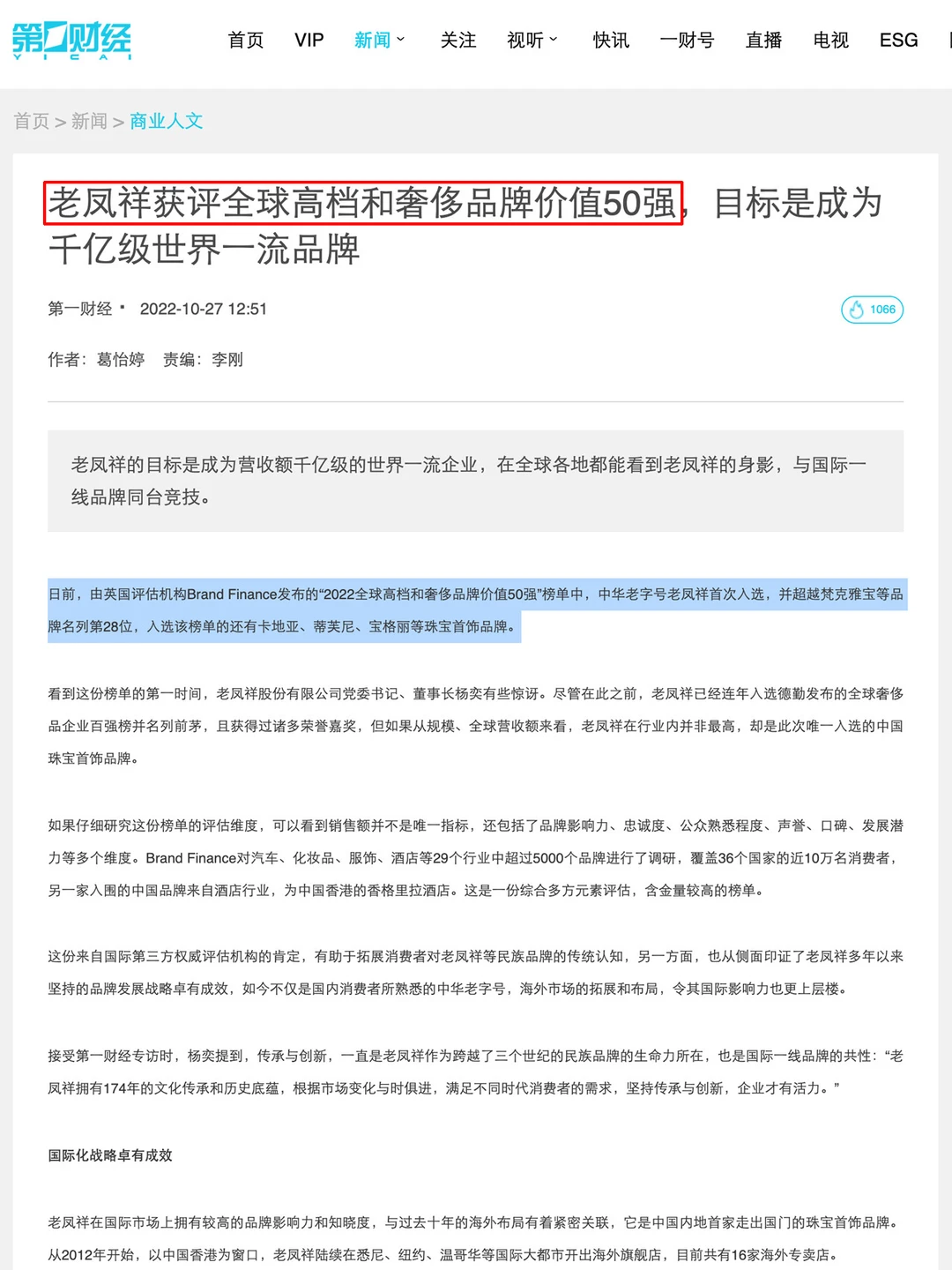 📘还有Brand Finance的英国品牌评估机构,他们发布的《2022全球高档和奢侈品牌价值50强》中,老凤祥排在第28位。关键是,它跟卡地亚、蒂芙尼、宝格丽这些国际大牌同在一个榜单,而且是入选的中国珠宝品牌!