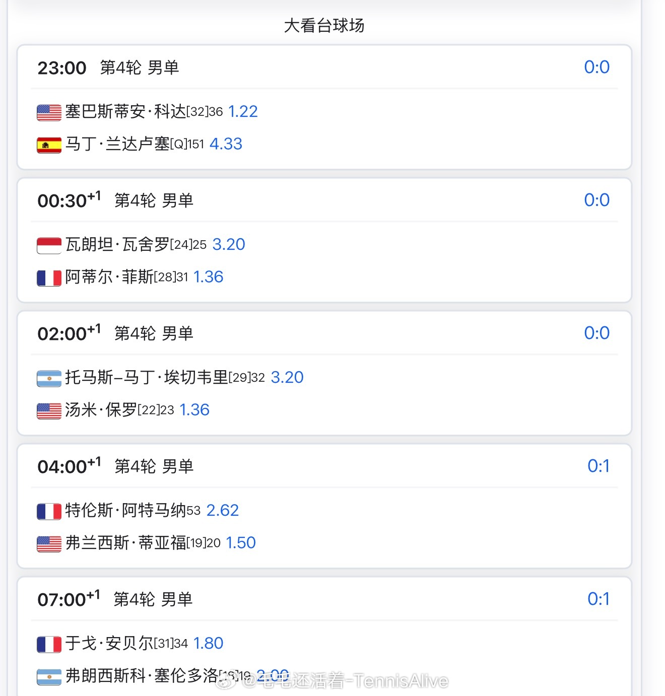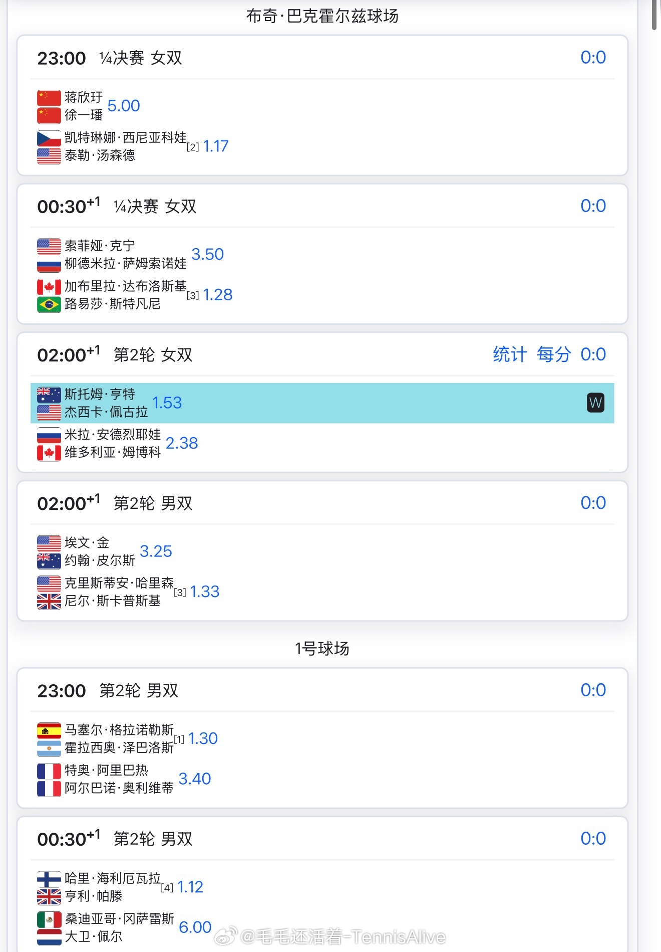2:00姆博科vs穆霍娃4:00辛纳vs米克尔森7:00本西奇vs高芙