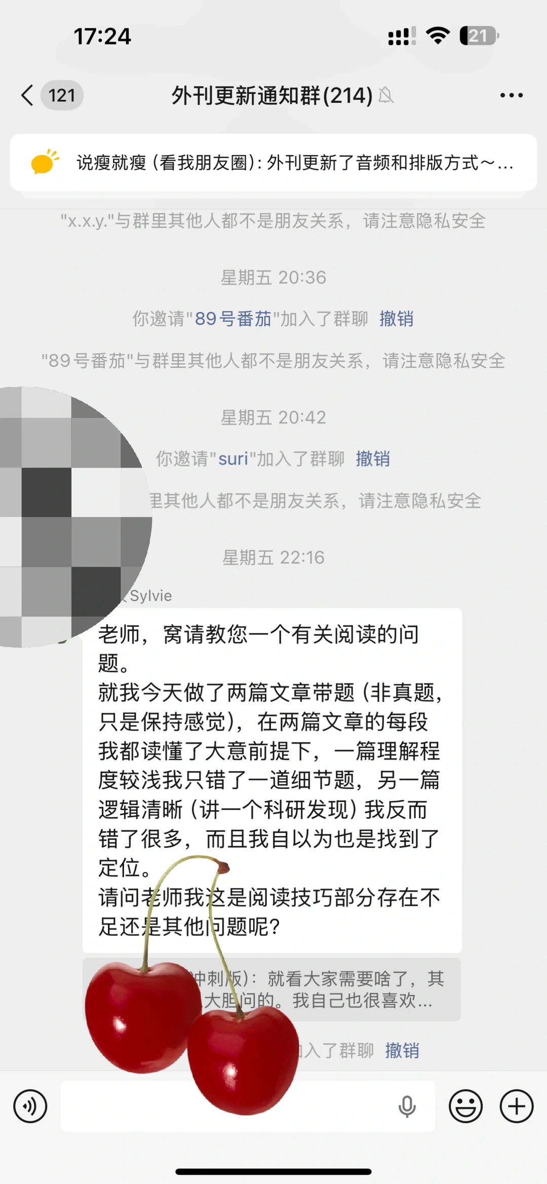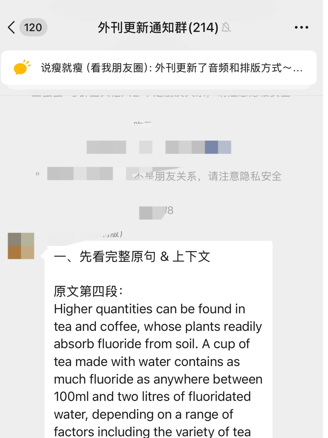 我给大家看一下我们外刊社群的学习氛围有多好,我前几天在外刊学习社群中新更新了外刊的纯英文版和篇目22,然后就有同学说跟不上我的更新节奏,现在英语基础太差了,还看不太懂。