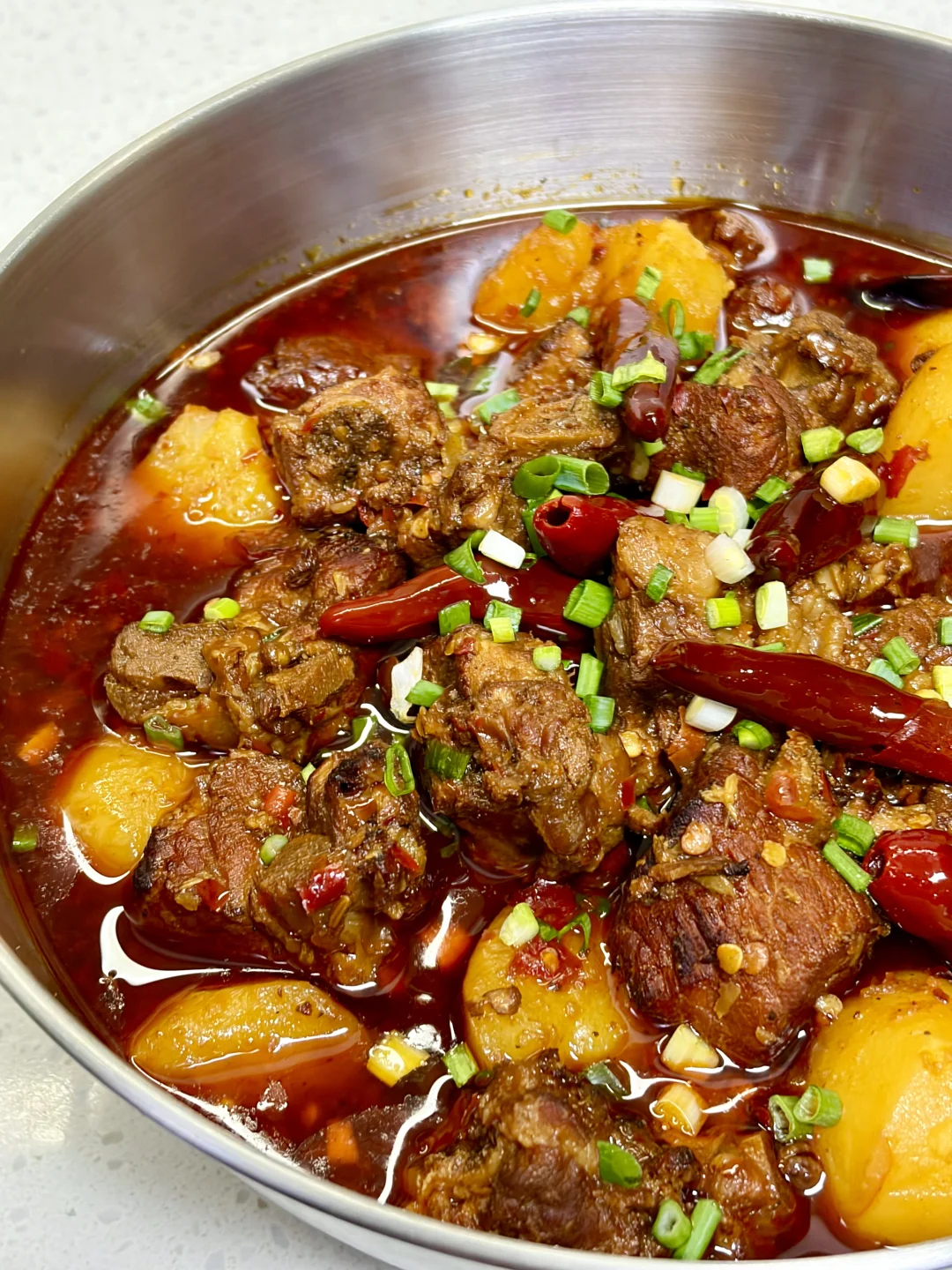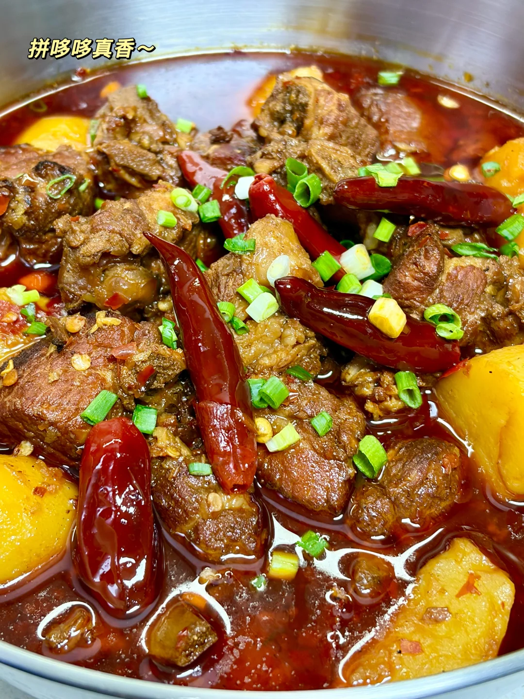 香辣土豆炖排骨 软糯的土豆加上脱骨的排骨超级香!今天加了点火锅底料,真的绝了,汤汁用来拌饭拌面绝了~