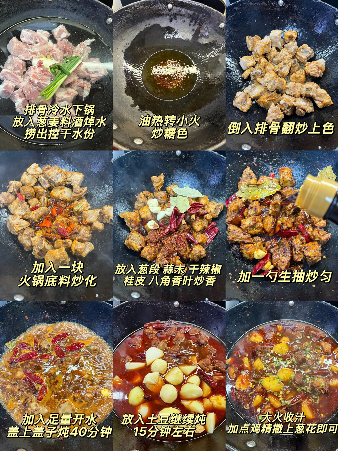 2️⃣:锅中油热转小火放入冰糖炒糖色,倒入排骨翻炒上色,加入一块火锅底料炒化,放入葱段 蒜末 干辣椒 桂皮 八角香叶炒香,加入一勺生抽炒匀
