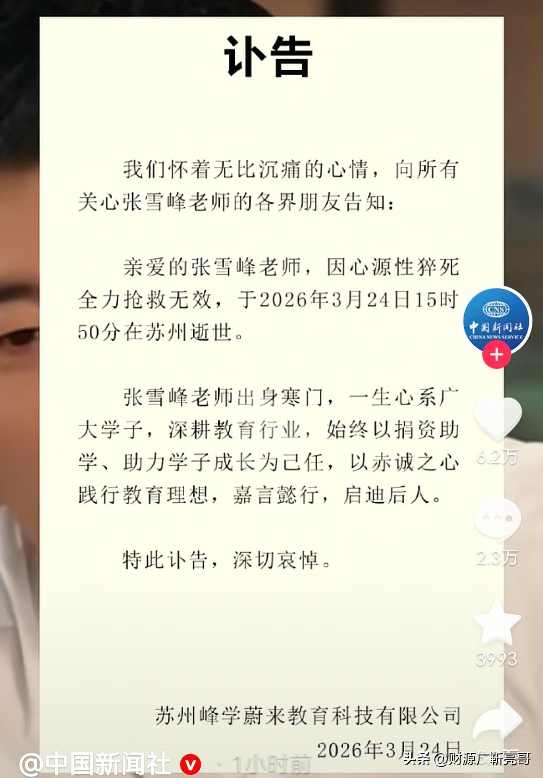 41岁张雪峰猝逝:别让拼命,变成拼命 41岁,正是人生爬坡的关键节点,张雪峰却倒在了他为之奋斗的事业里。从课堂上为万千学子指点迷津,到直播间里为普通人拆解人生选择,他用自己的“拼命”,照亮了无数家庭的前路,却忘了为自己的健康按下暂停键。 我们总以为“年轻就是资本”,把熬夜加班、透支身体当作奋斗的勋章,却忘了健康才是一切的根基。那些被忽略的胸闷心悸,那些被强行压下的疲惫,终会在某个瞬间变成压垮生命的最后一根稻草。张雪峰的离去,是一声沉重的警钟:奋斗从不等同于拼命,真正的成长,是在热爱的事业与健康的身体之间找到平衡。 别让“等我忙完这阵”成为永远的遗憾。多喝一杯温水,多走一段路,多给自己一点休息的时间。生命没有重来的机会,好好活着,才是对自己、对家人最负责的交代。 你觉得呢?教育大v张雪峰 张雪峰求职 张雪峰访谈 张雪峰高考真相 对张雪峰 张雪峰简历 张雪峰采访视频