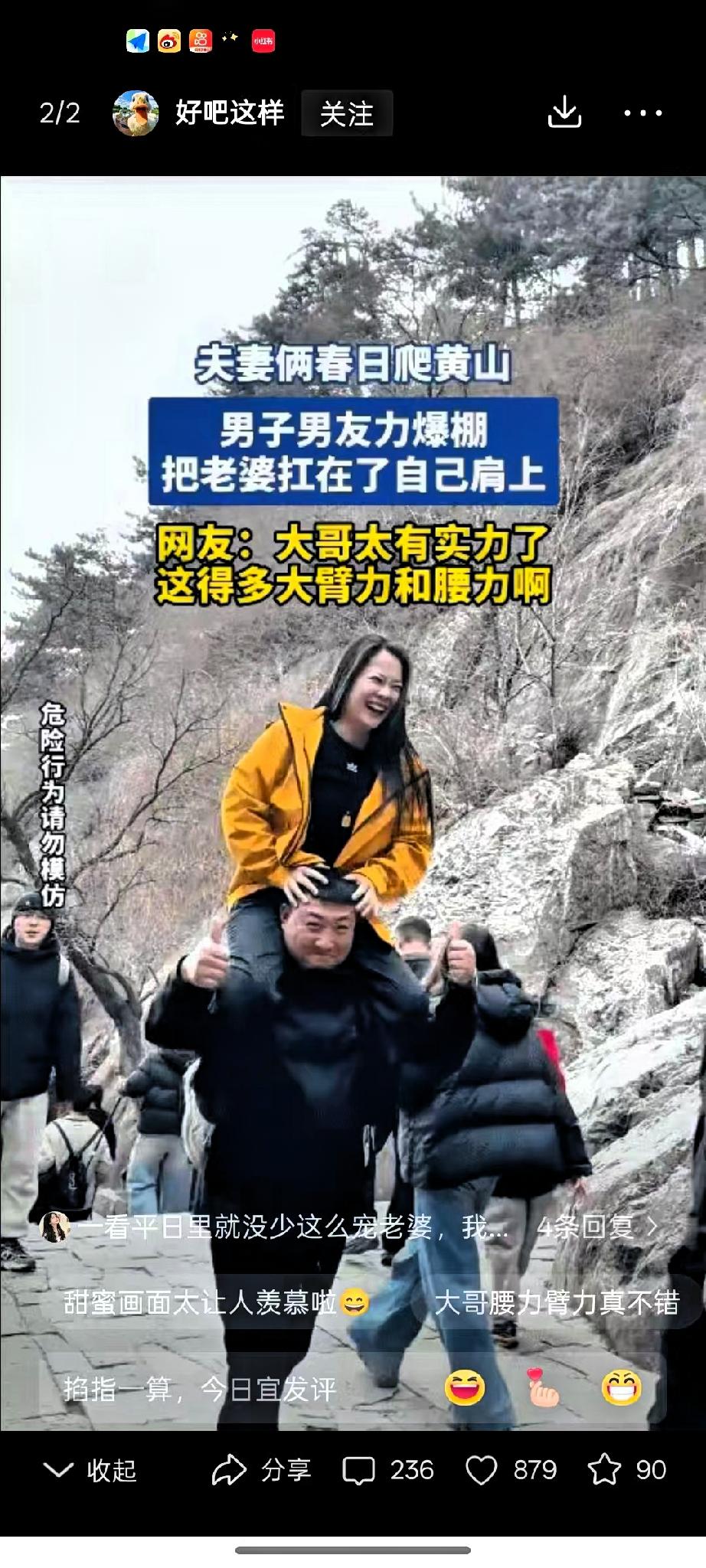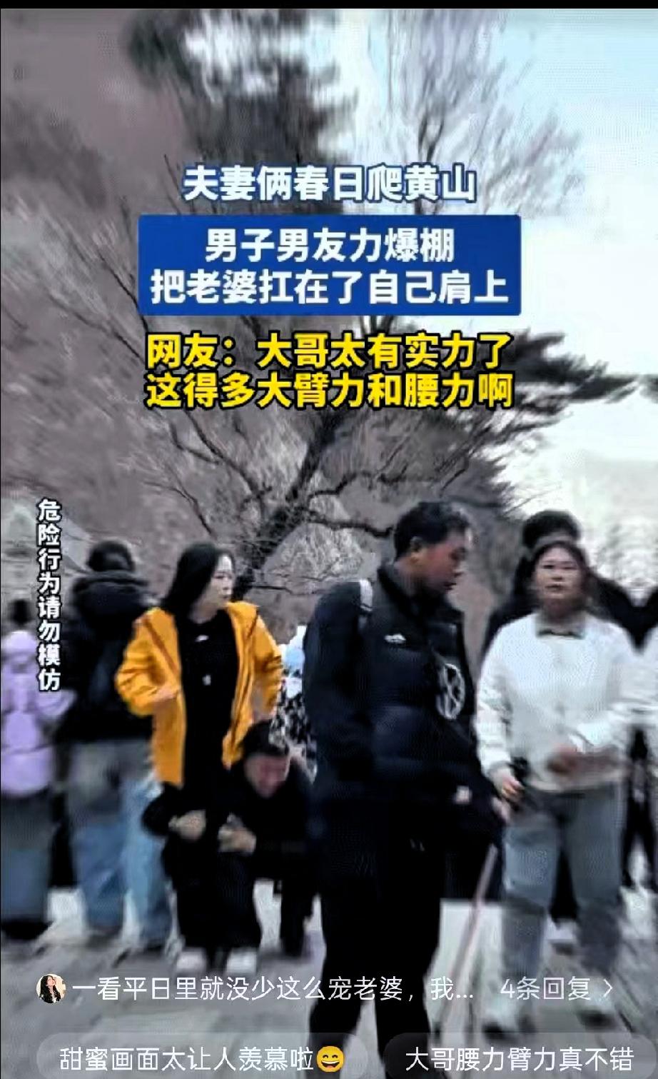 一觉睡醒,黄山扛老婆爬山的大哥,怕是要笑晕在评论区! 原本只是一次普通的春日游,一个很平常的宠妻举动没想到被路人拍下后迅速传播,引来不少网友关注和点赞。 黄山景区游客较多,山路台阶较陡,不少游客轻装爬山都觉得吃力,需要边走边休息。这位大哥在登山途中,将妻子扛在肩上前行,步伐相对平稳,两人神情也比较轻松。这一幕在疲惫的登山人群中显得格外显眼,也让不少路人印象深刻。 视频传开后,很多网友纷纷留言,有人感慨大哥体力不错,也有人羡慕这种朴实的陪伴。大家更多是被这份自然的温情打动,没有华丽的表达,却透着实实在在的在意,也因此收获了不少好感。 不过温馨提示也很有必要,黄山山路复杂、人流量大,扛人爬山会影响视线,容易造成重心不稳,存在一定安全隐患,同时也可能给身边其他游客带来不便。这样的行为并不值得大家效仿。 感情动人的地方,从来不是靠引人注目的方式,而是藏在踏实的照顾和平稳的陪伴里。出门游玩,安全始终是第一位,文明出行、照顾好彼此,才是更长久也更靠谱的浪漫。真正的疼爱不需要刻意显眼,平平安安、舒心自在,比什么都重要。